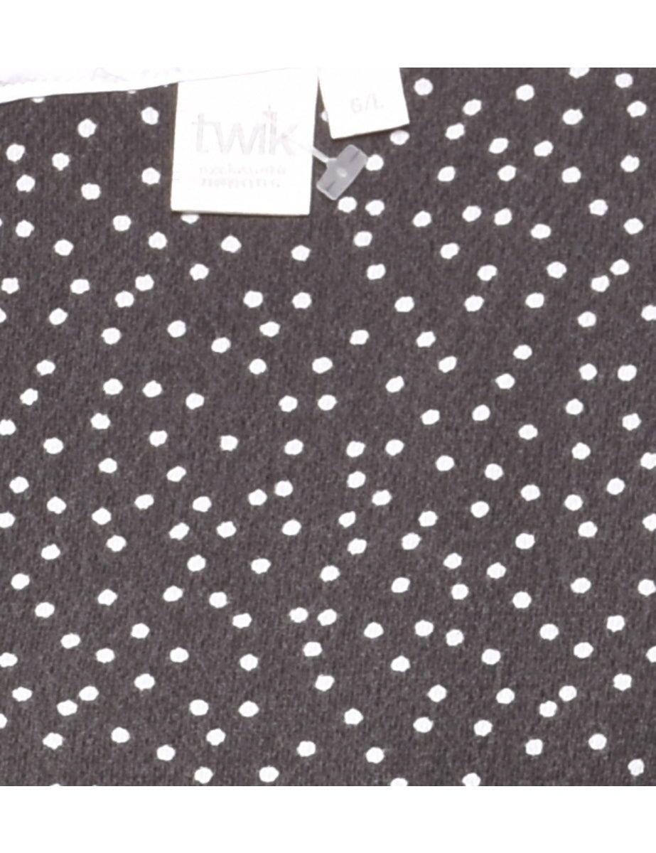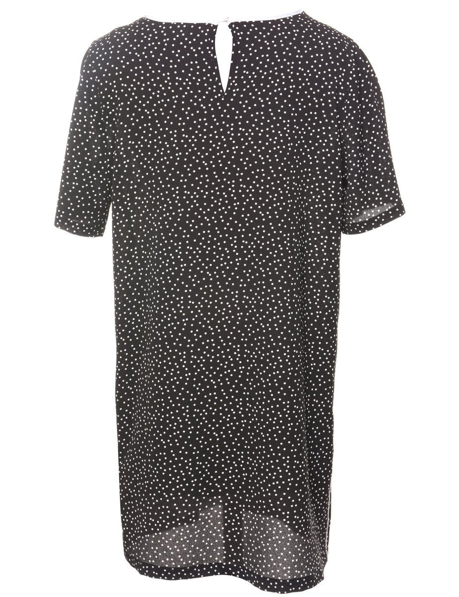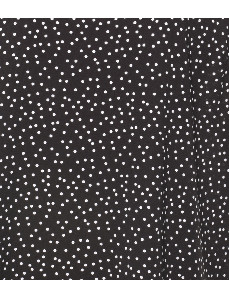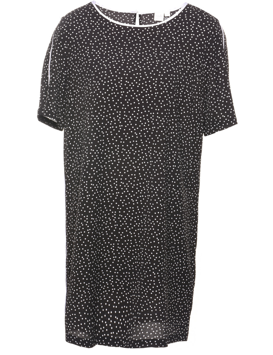 Polka dot dress comes in black with a round neck and contrasting trim.