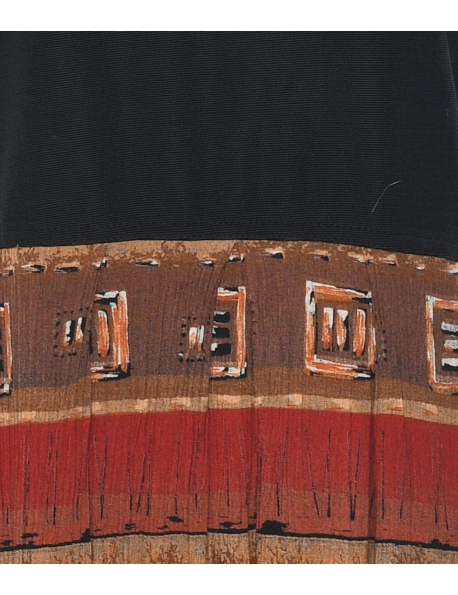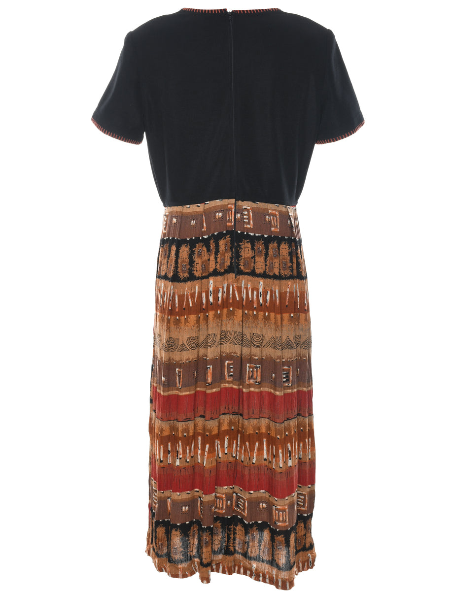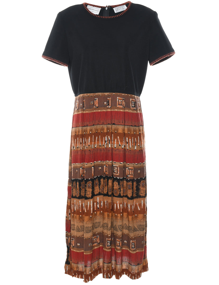 Multi-colour dress with abstract pattern, a round neck and removable shoulder pads.