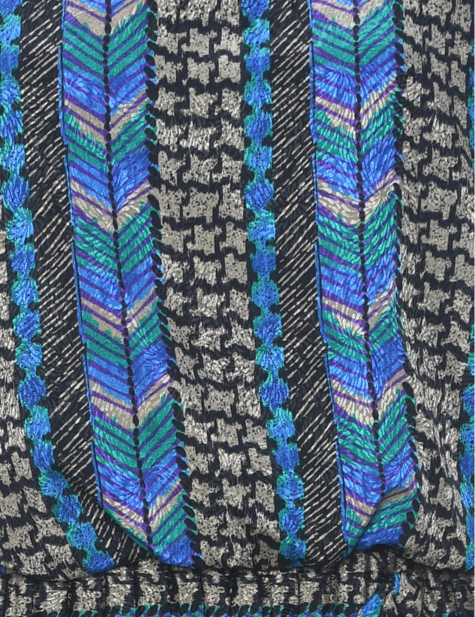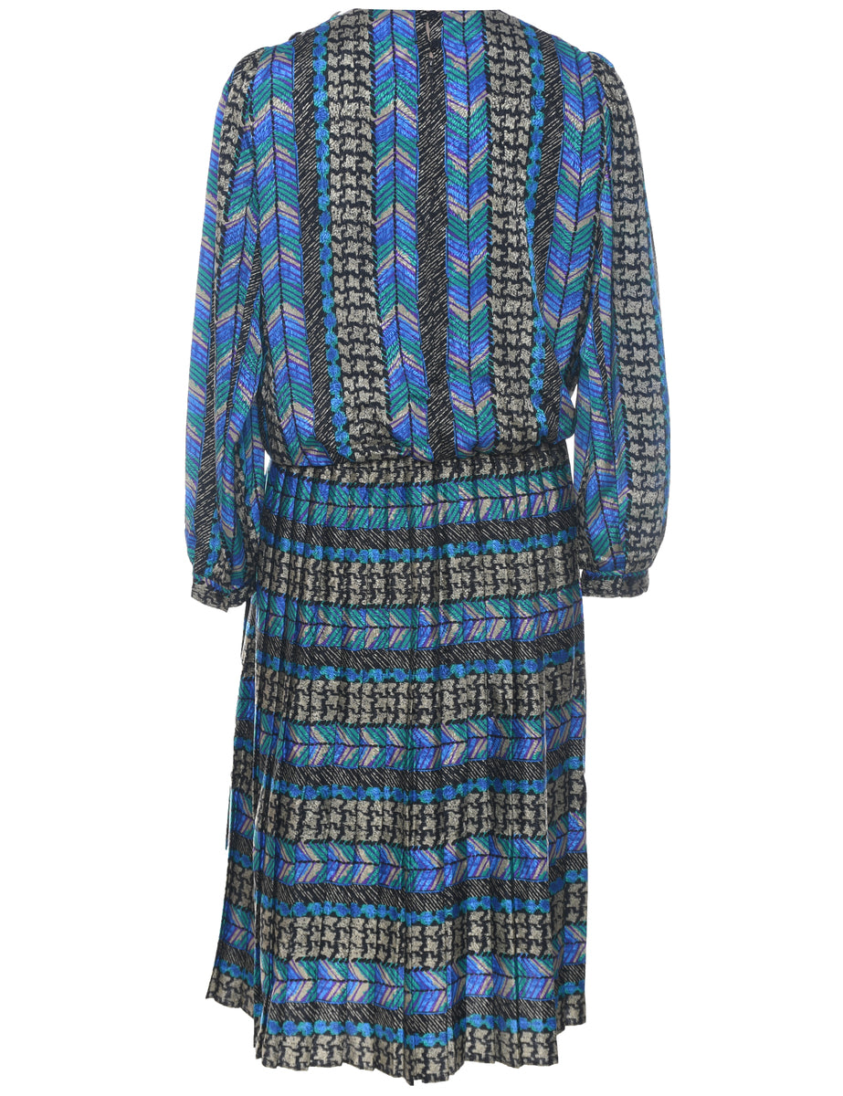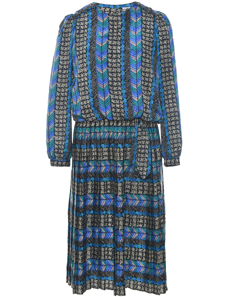 Multi-colour dress with abstract pattern, elastic waist and puff sleeves.