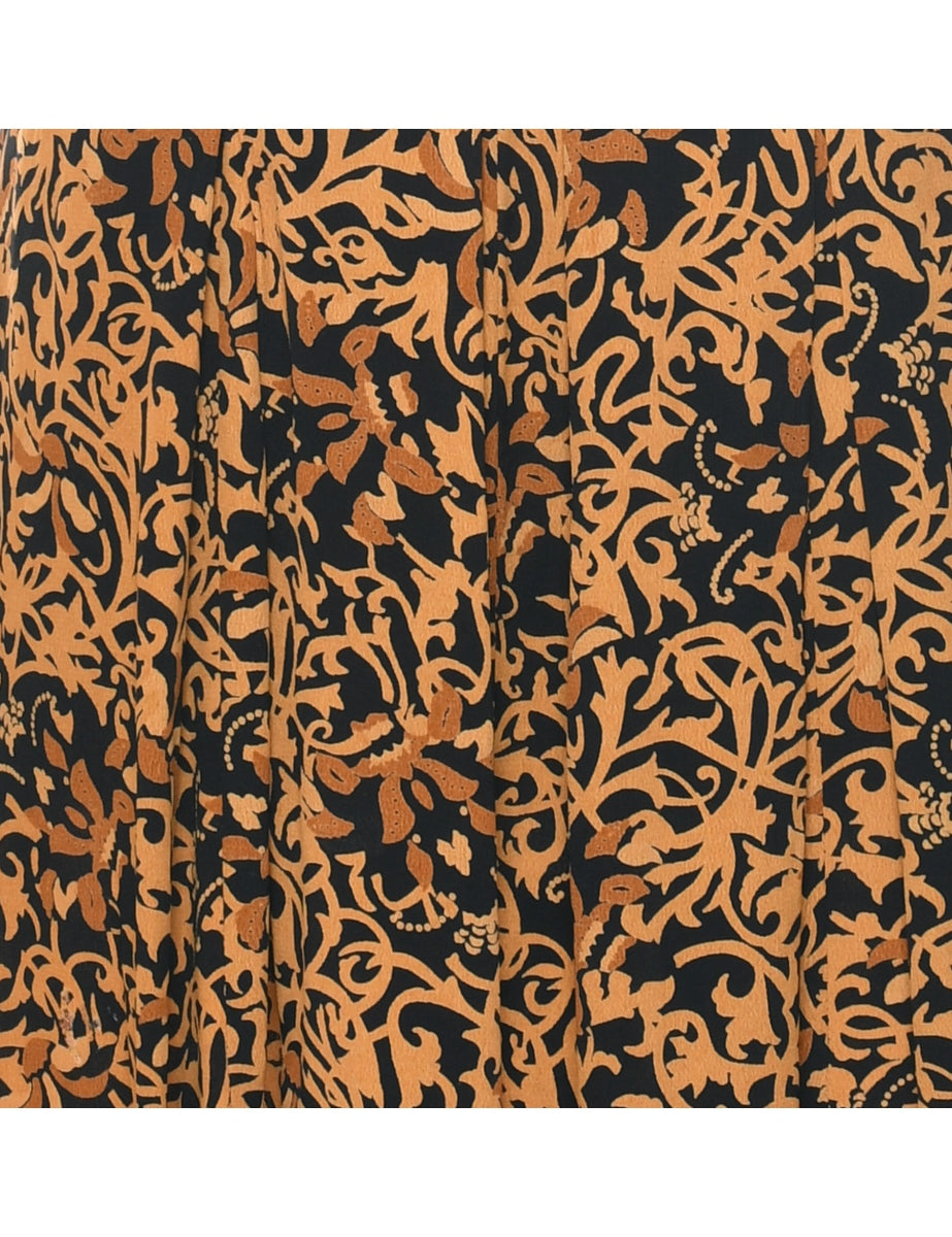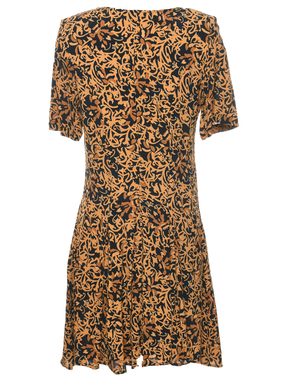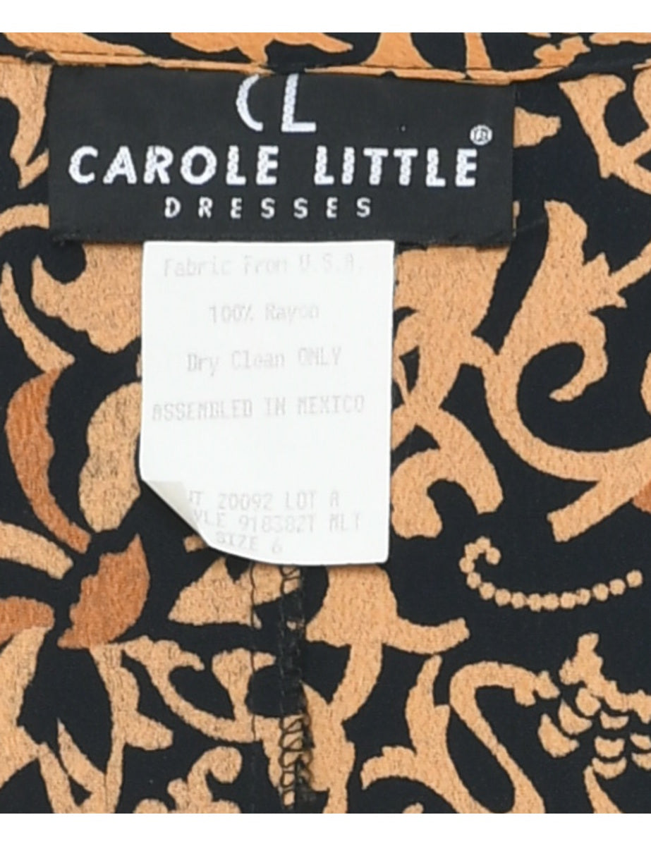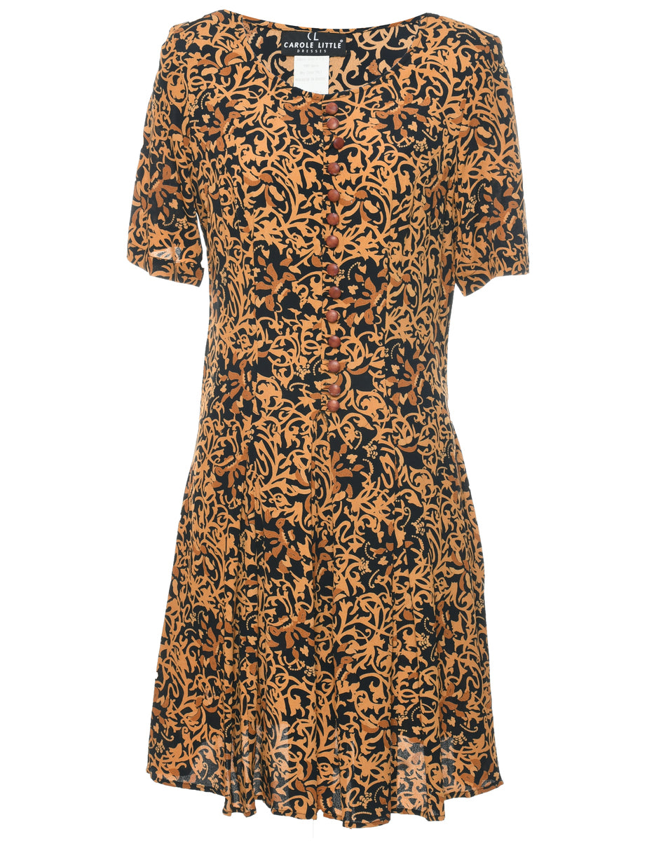 Leafy print dress in black & brown with removable shoulder pads.