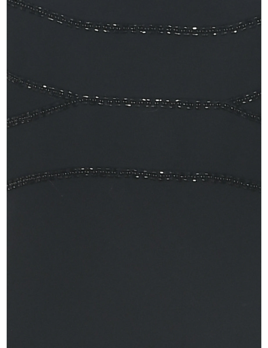 Midi length evening dress. Comes in black with a round neck.