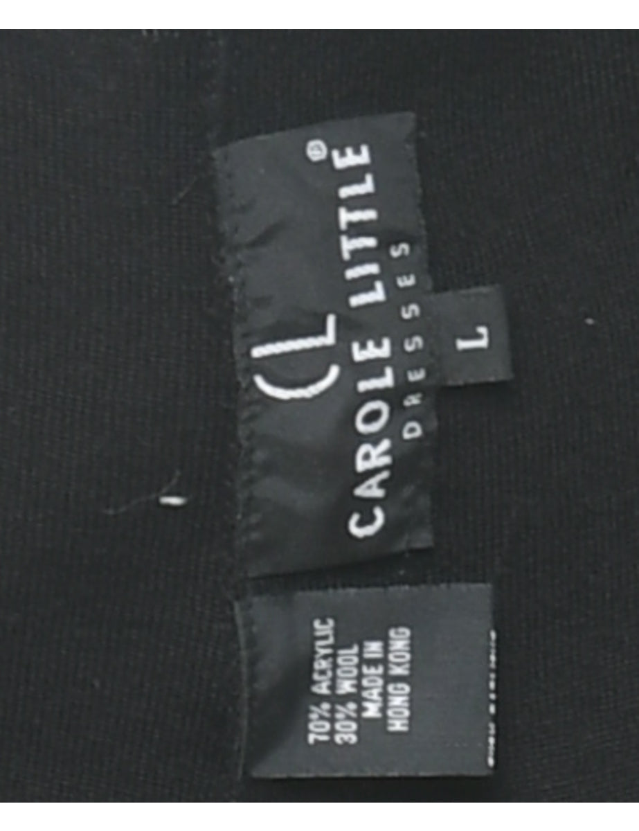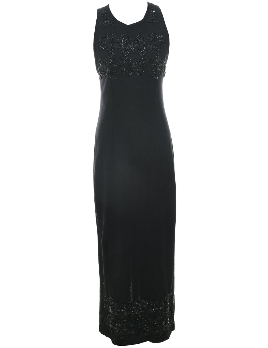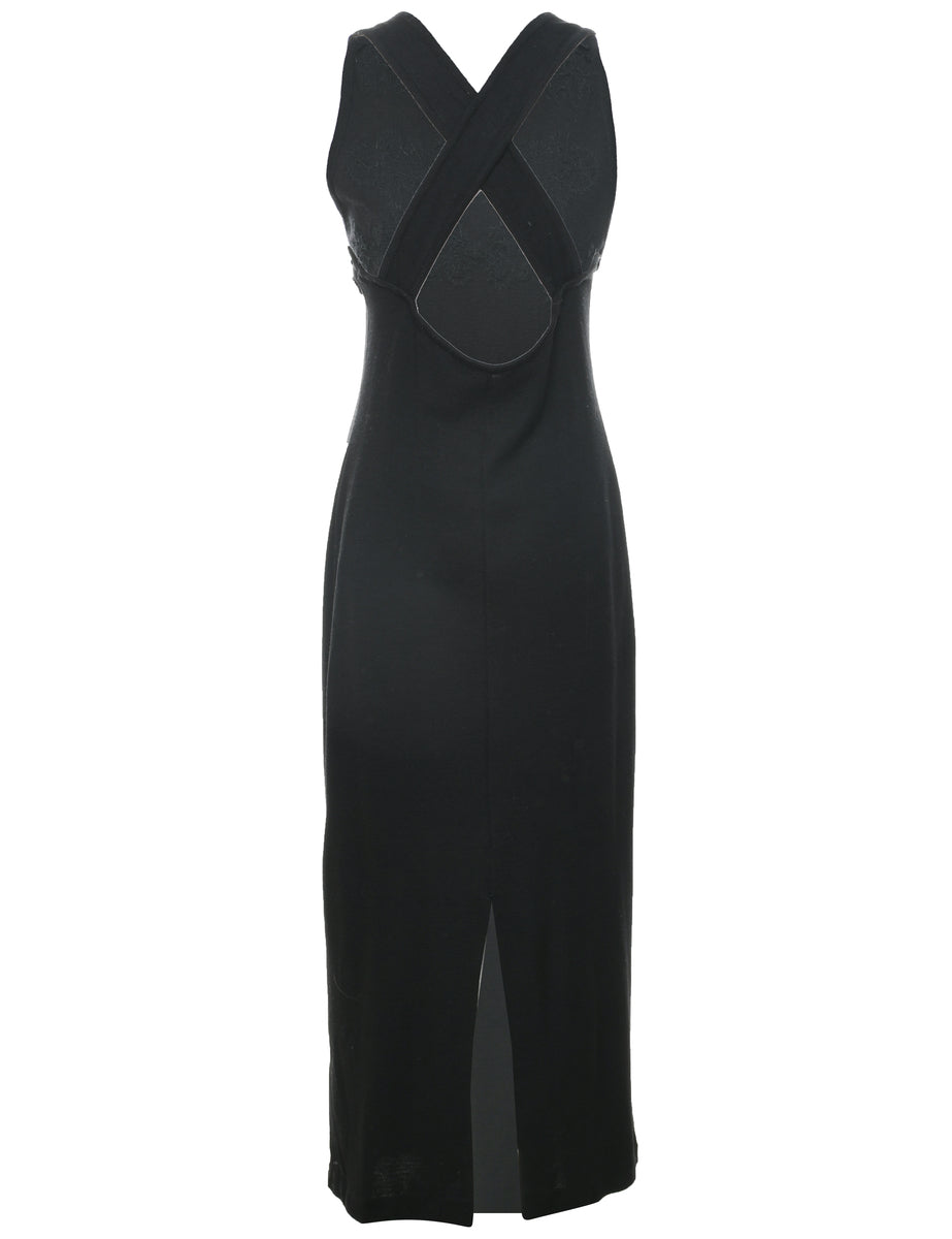 Beaded dress in black with a criss cross back and slit. From the brand Carole Little.