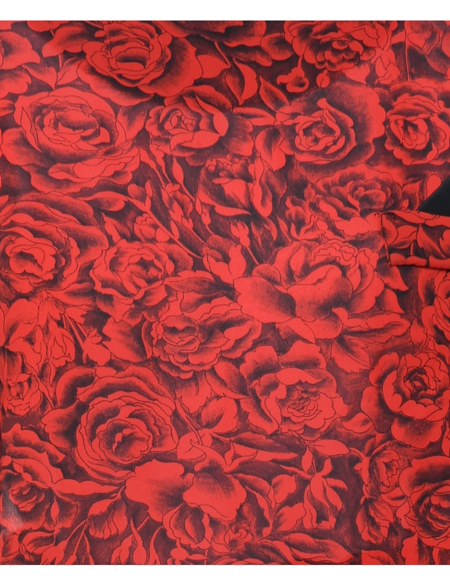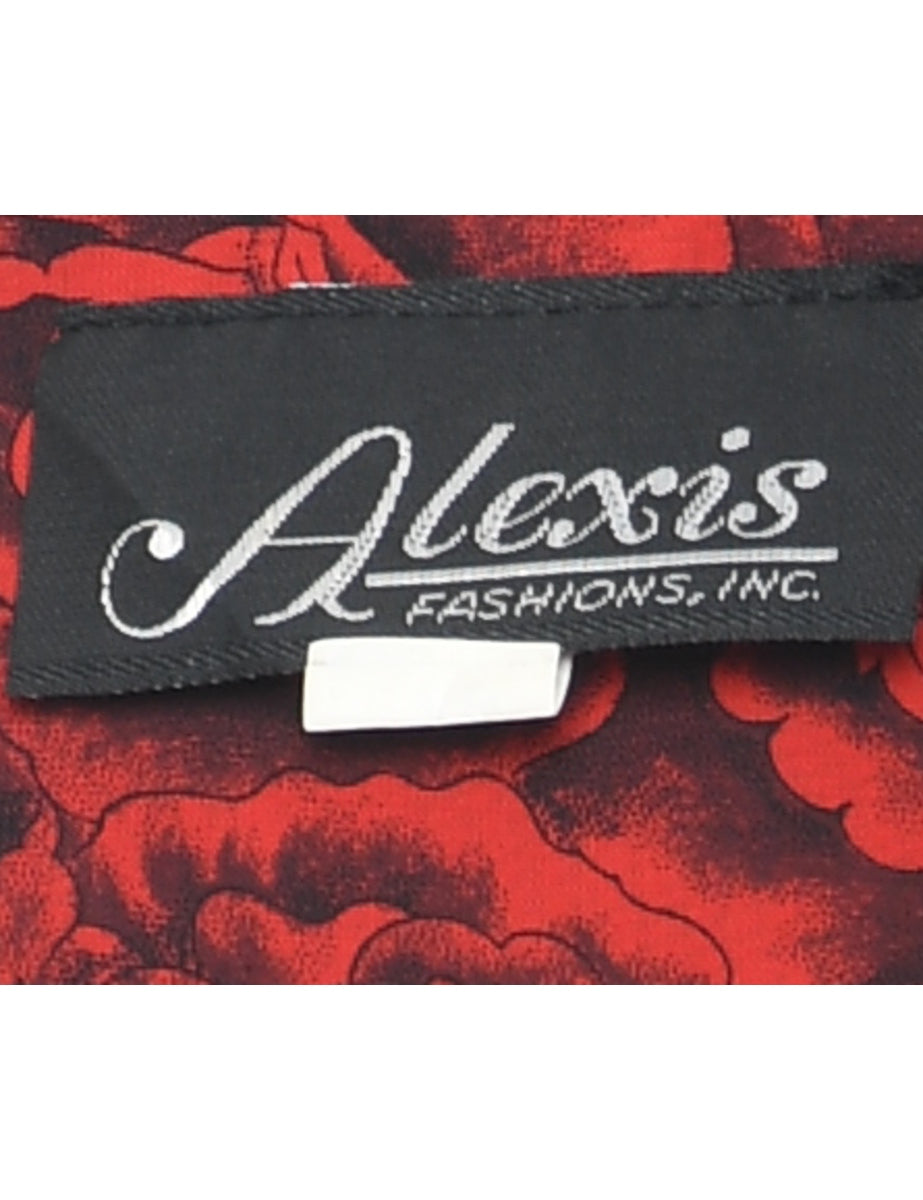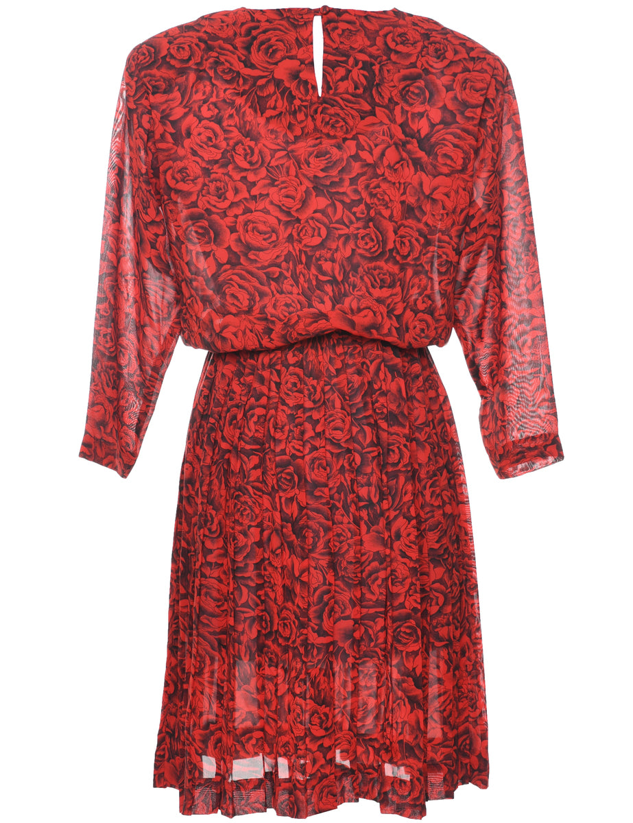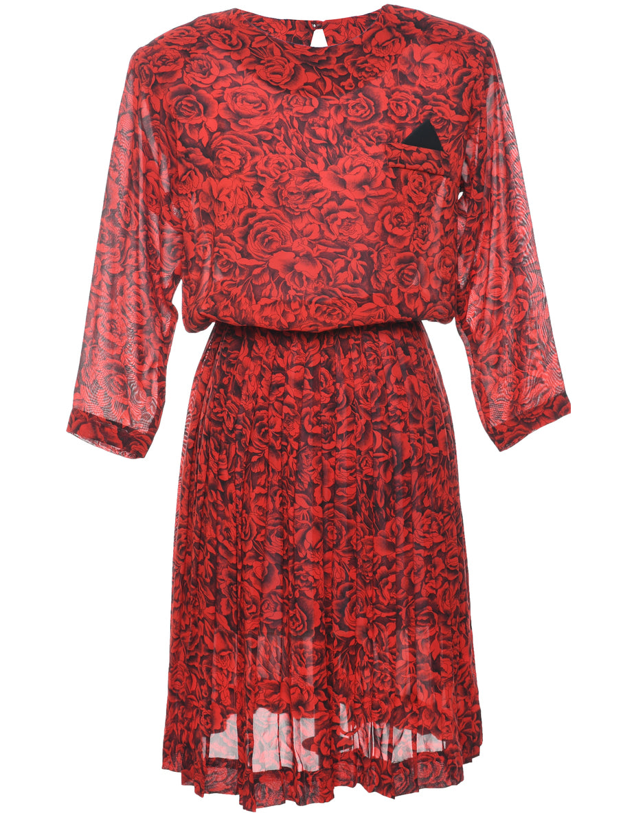 Floral print dress comes in black & red with elastic waist and removable shoulder pads.