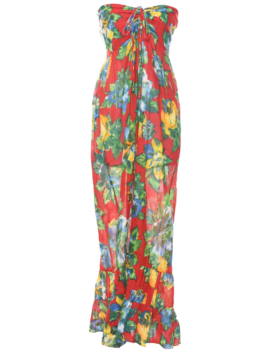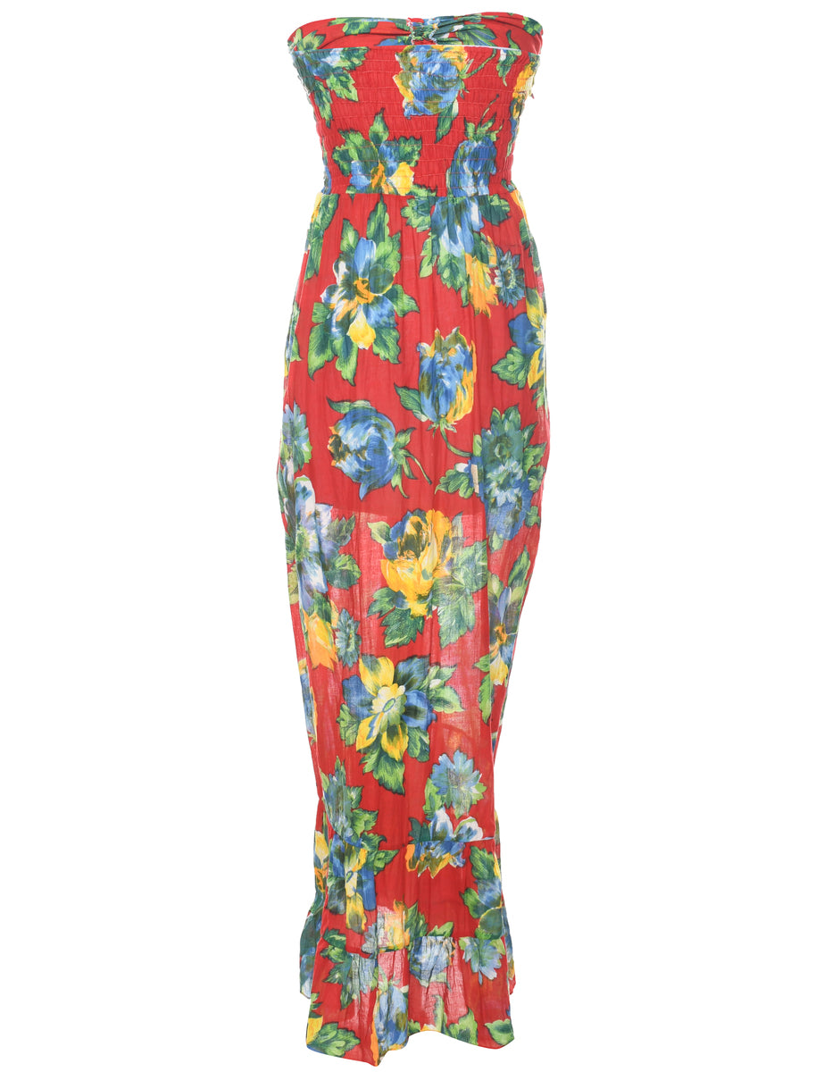 Floral print strapless dress comes in multi-colour with an elasticized back and a fishtail hem.