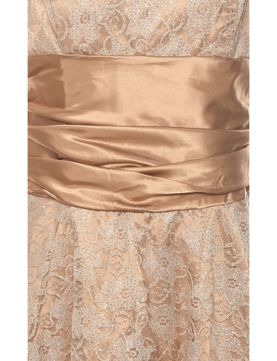 Lace party dress in gold with ruched detailing.