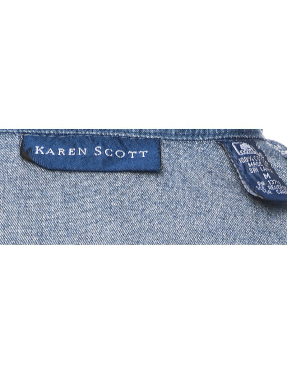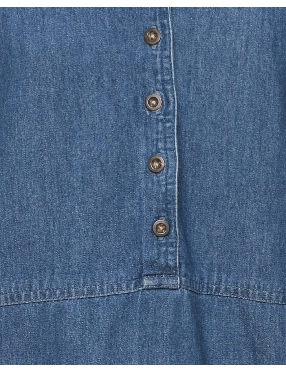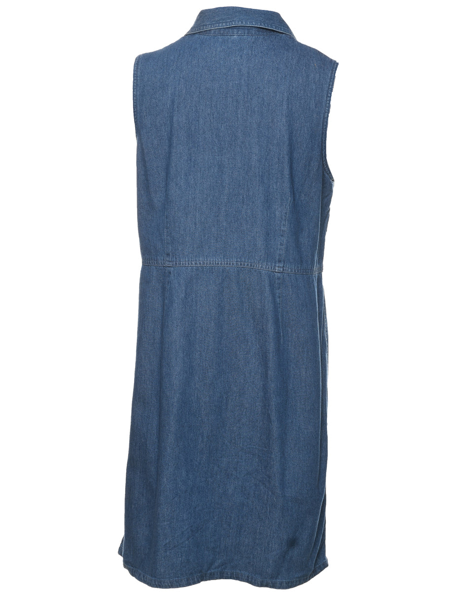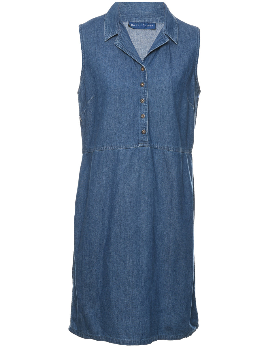 Sleeveless denim dress. Comes in medium wash with a revere front.