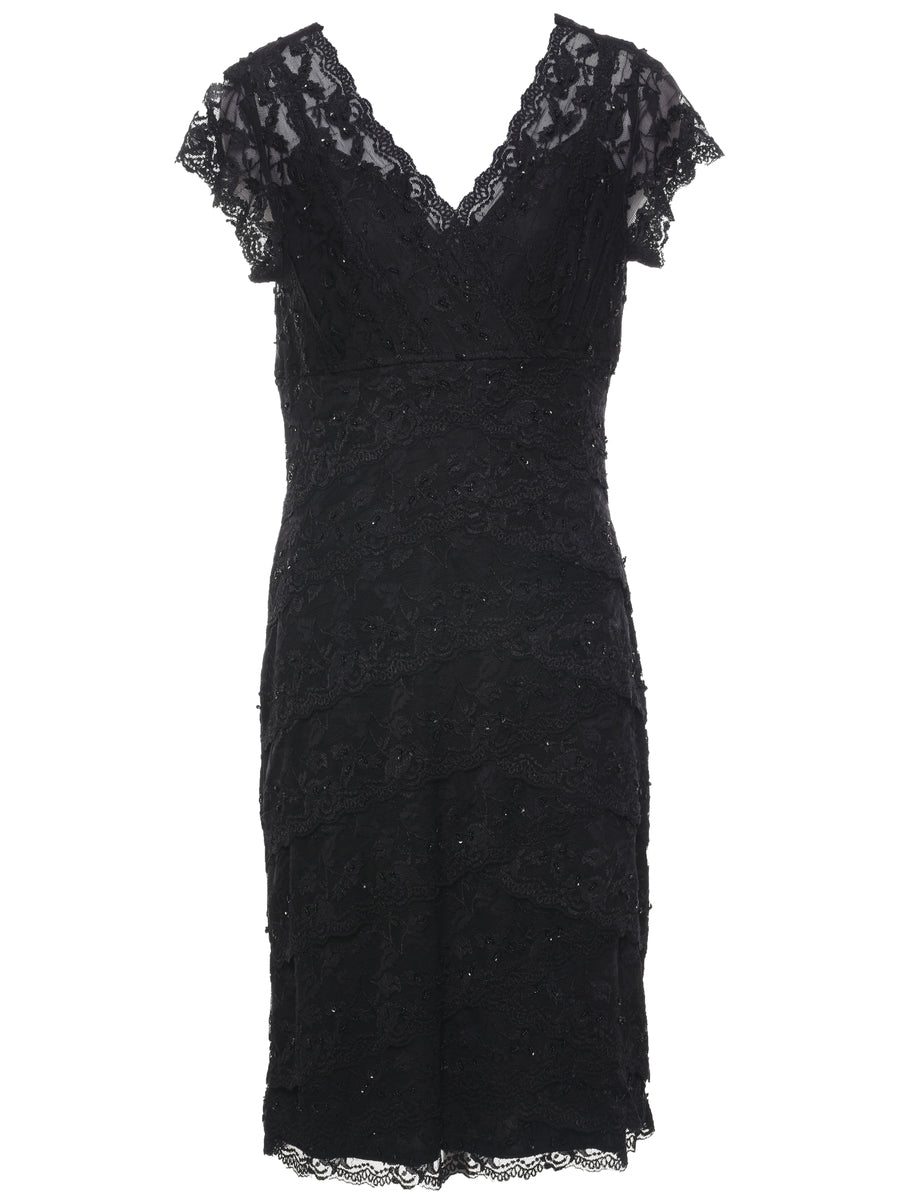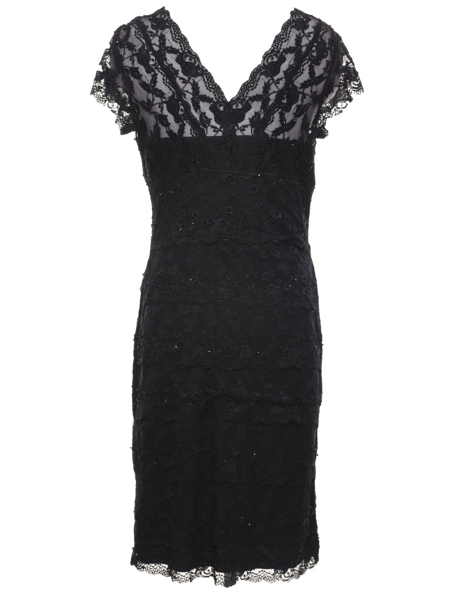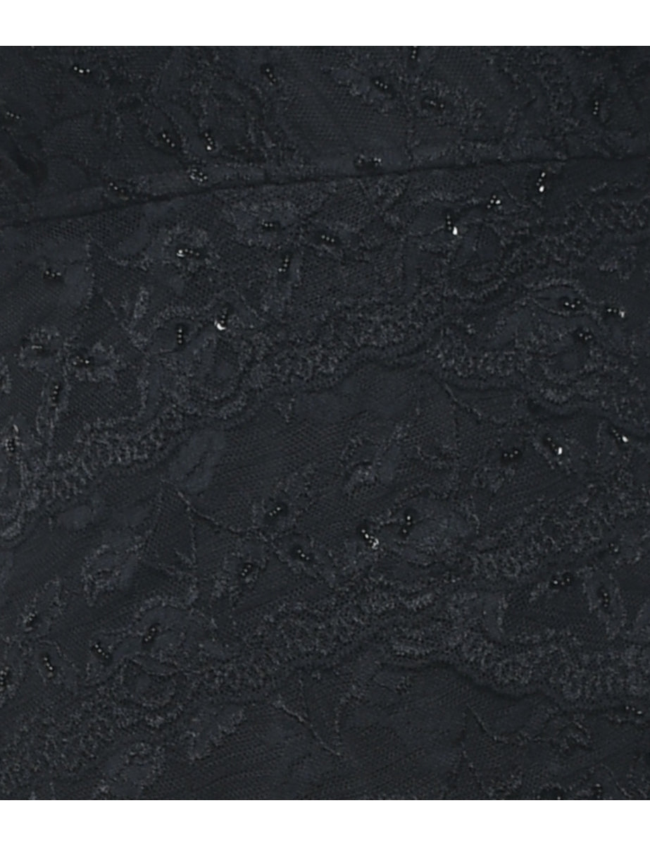 Lace evening dress with floral pattern. Comes in black with a cross-over front and contrasting lining.