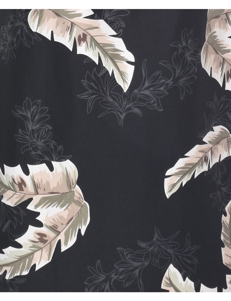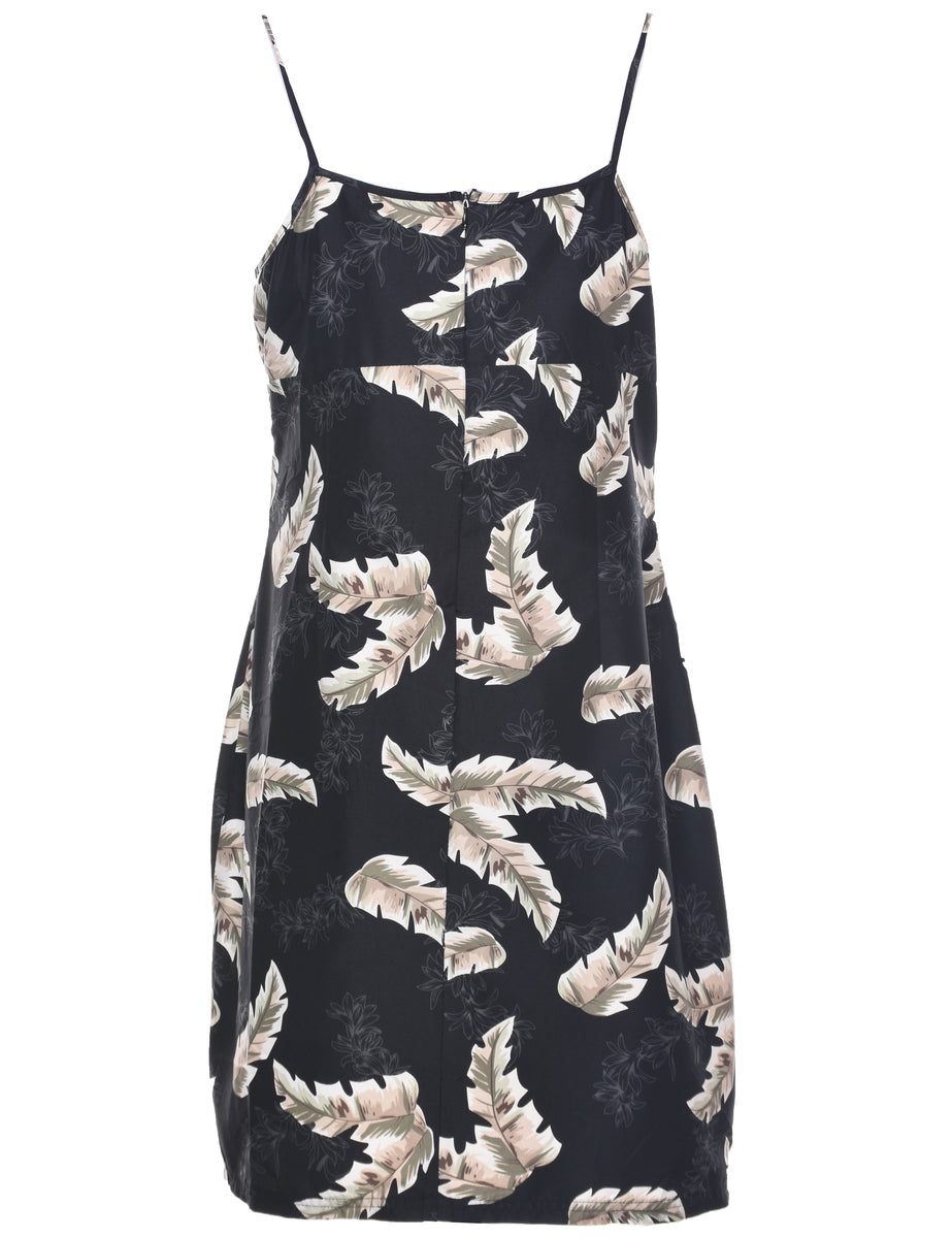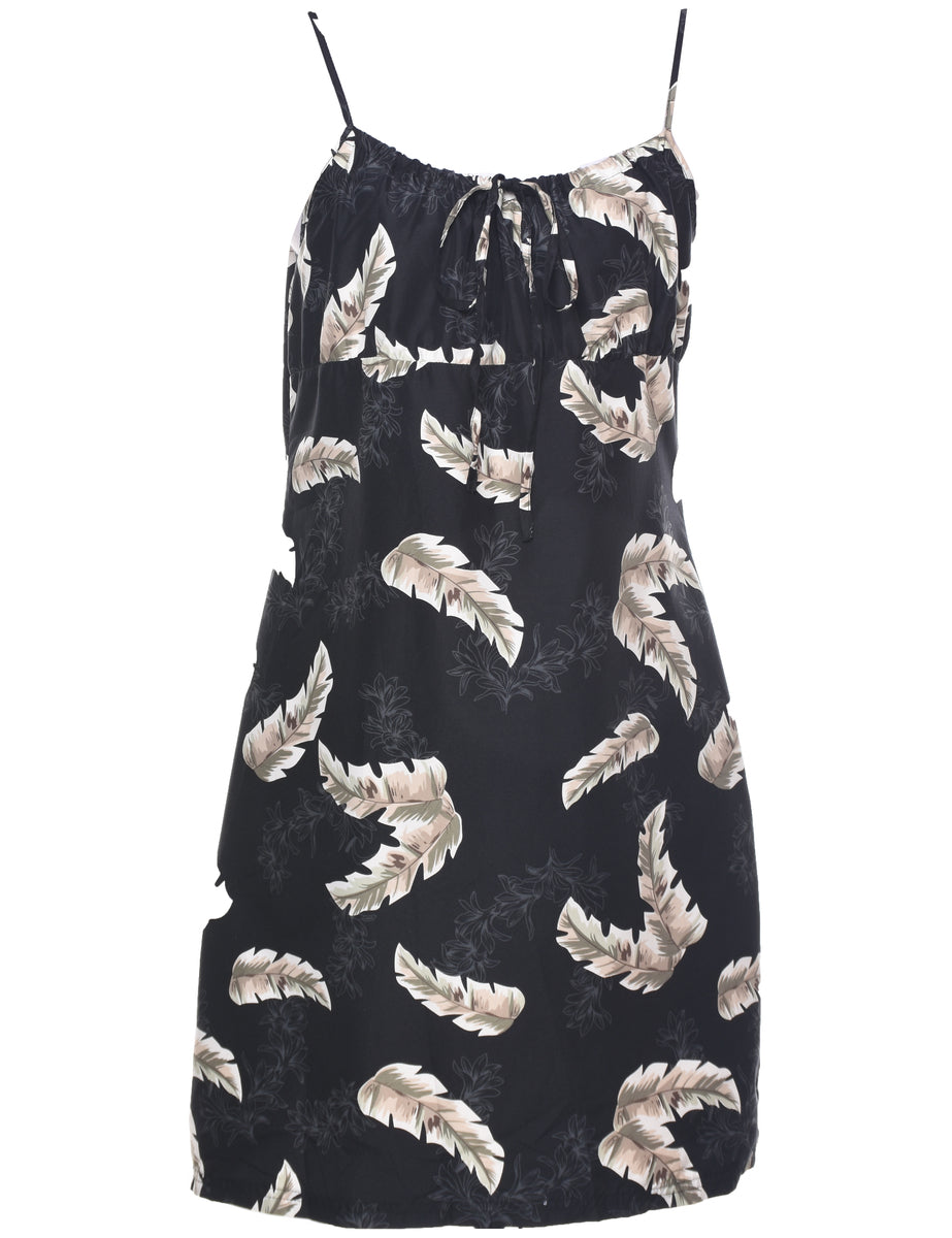 Leafy print strappy dress in black with floral pattern, a neck tie.