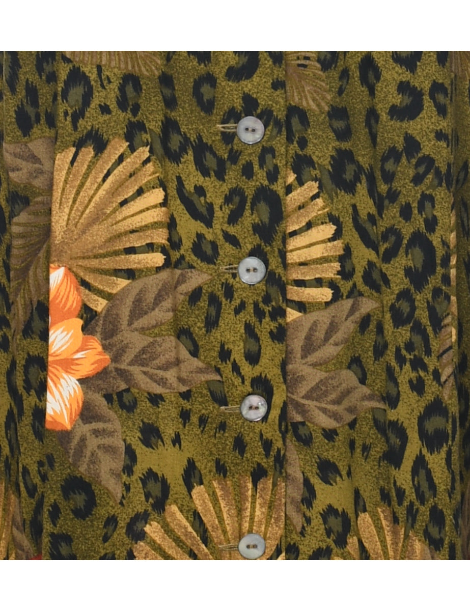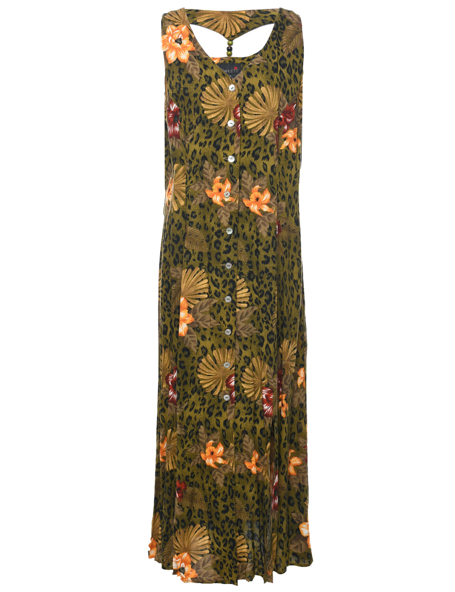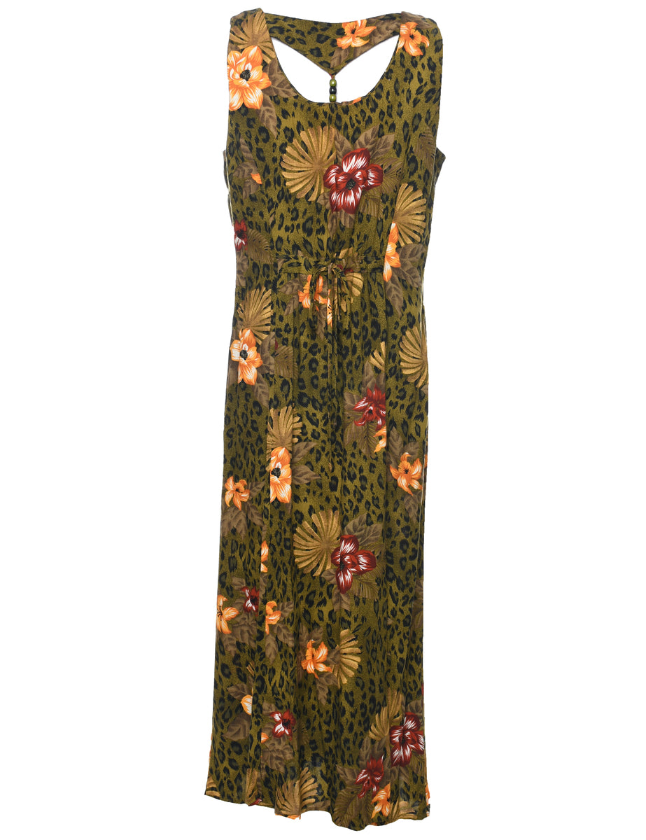 Sleeveless dress in olive green with leopard print, key hole neckline.