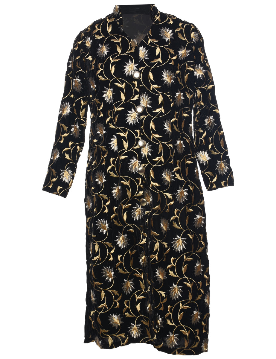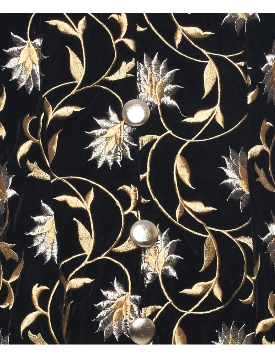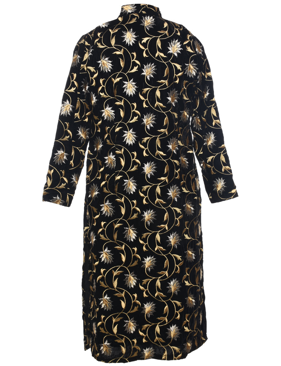 Lurex thread pattern velvet evening dress with floral pattern. Comes in black with decorative buttons and a grandad collar.