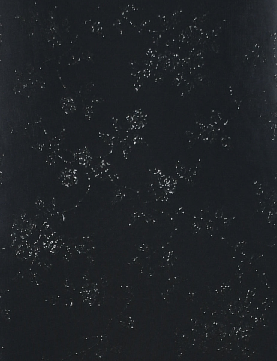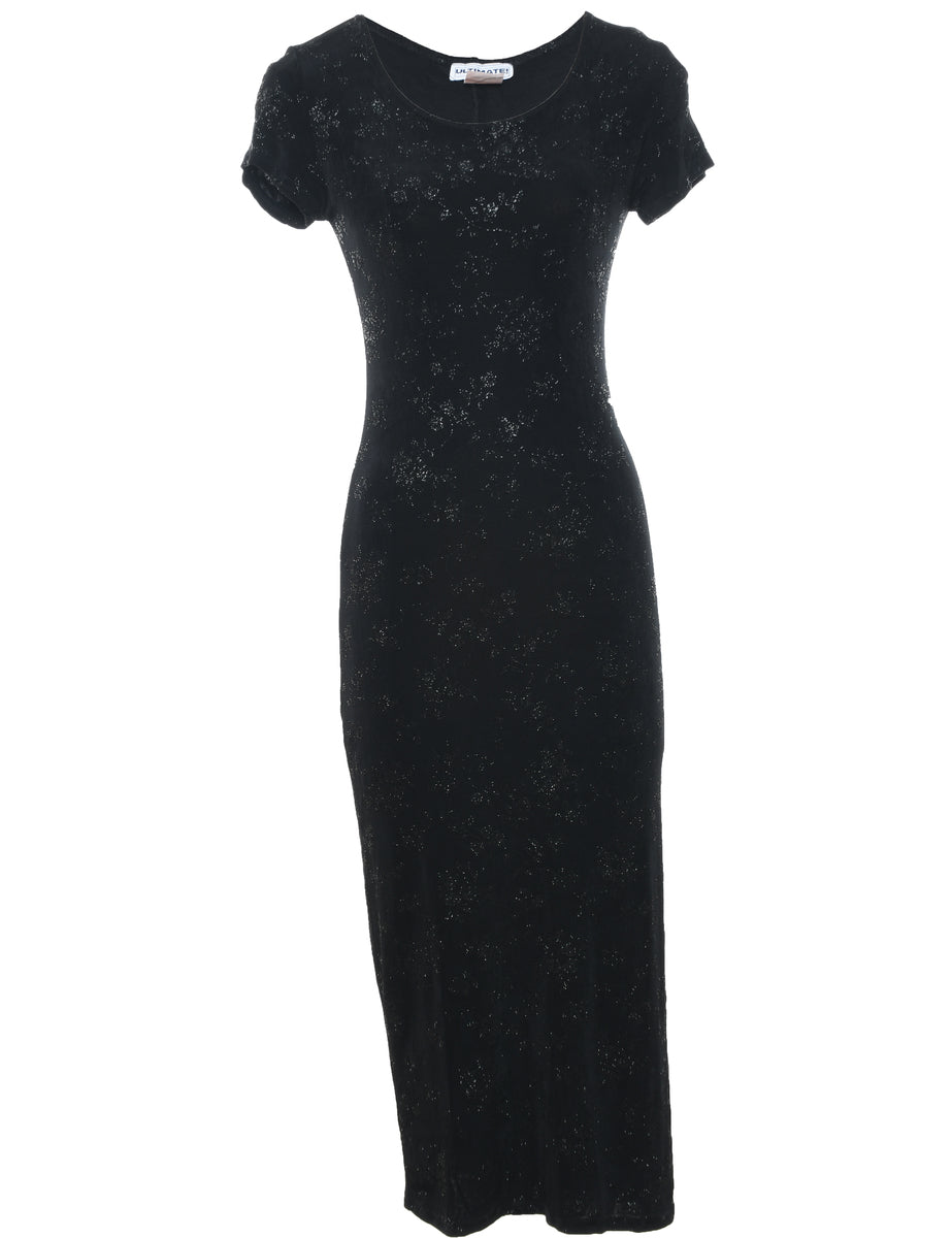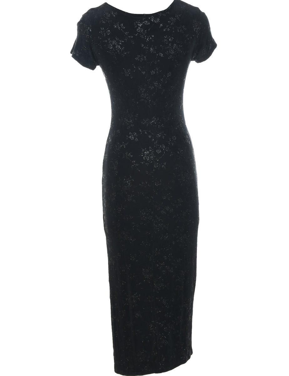 Floral print evening dress with metallic pattern. Comes in black with a round neck and slit.