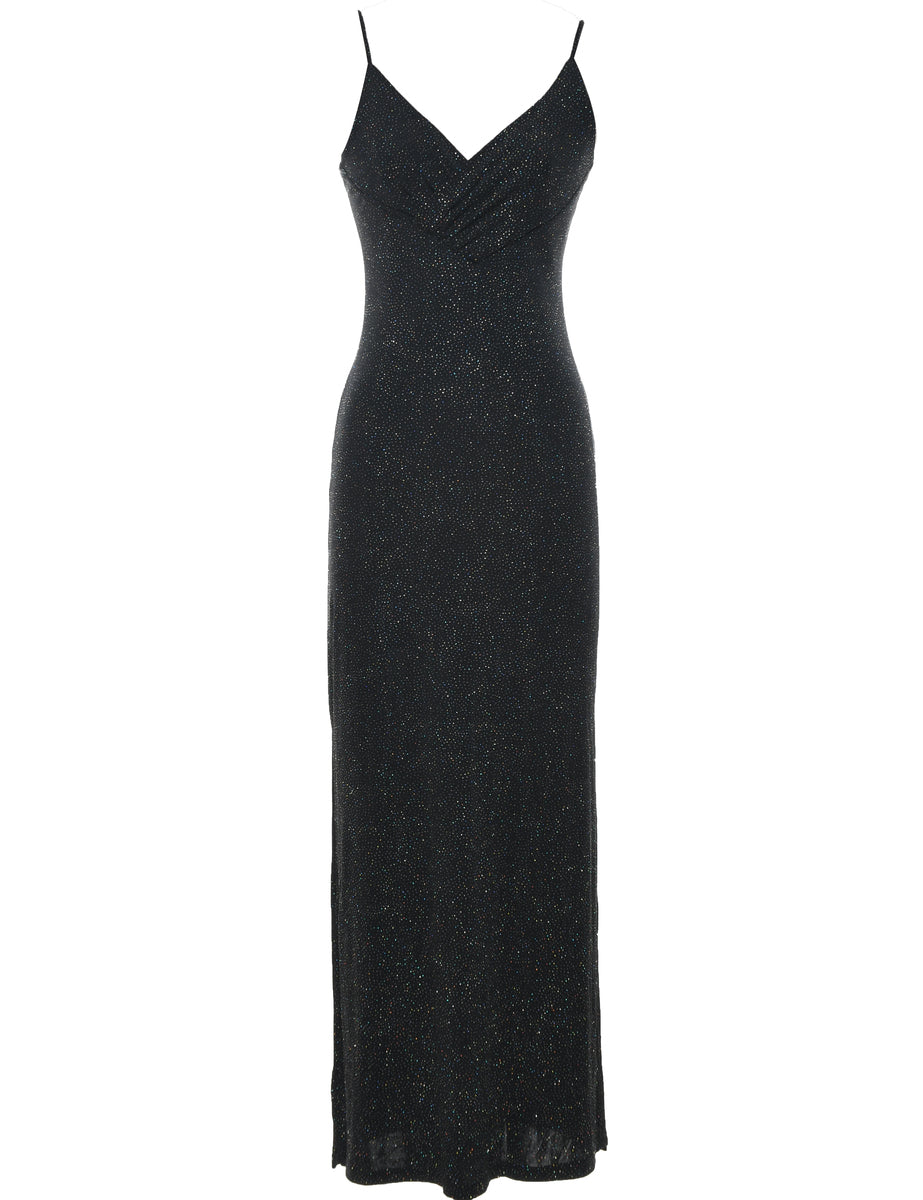 Strappy evening dress comes in black with metallic pattern, a cross-over front.