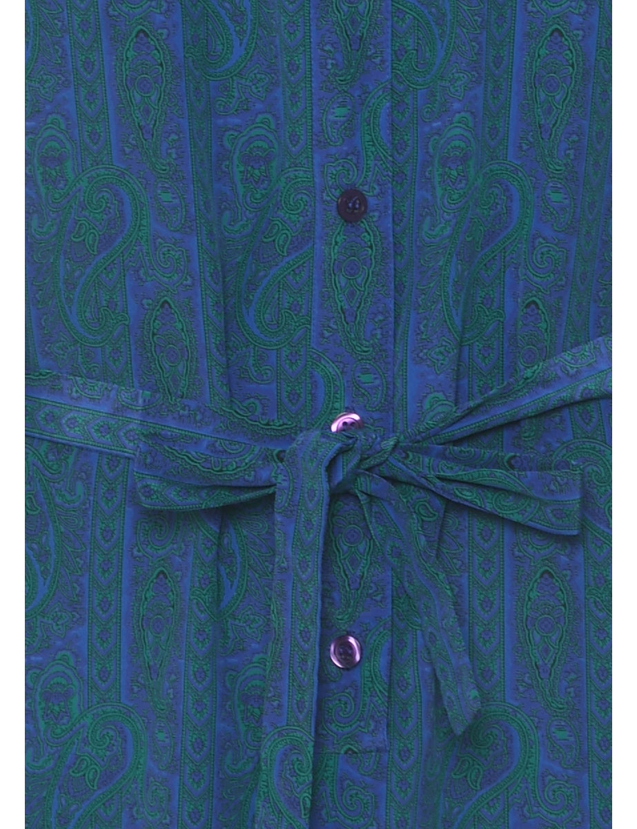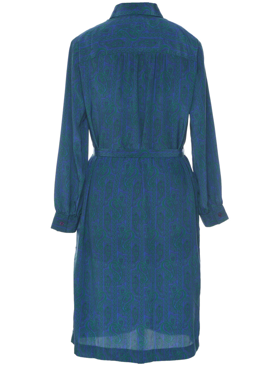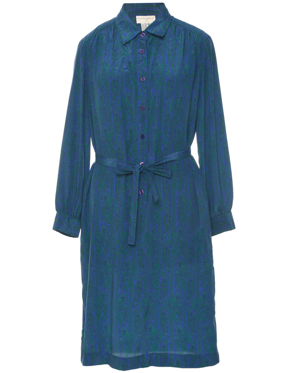 Paisley print shirt dress in blue with a classic collar and a belt.