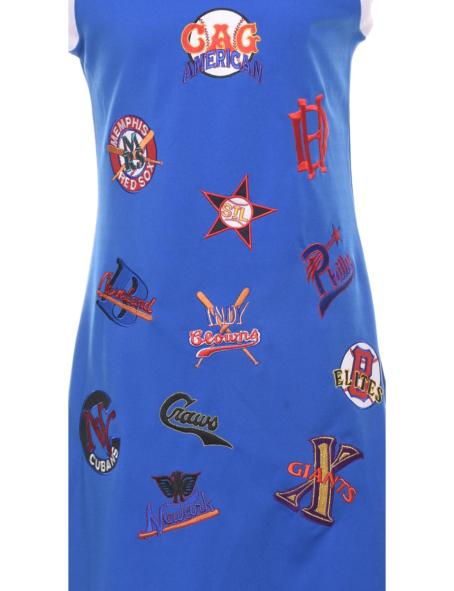 Patchwork blue dress with contrasting trim.The size label mentions XL but based on the actual measurements we consider it a size M.