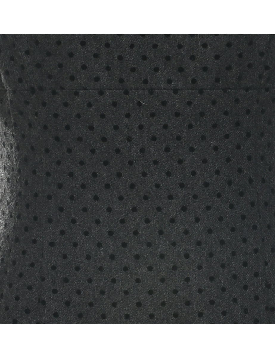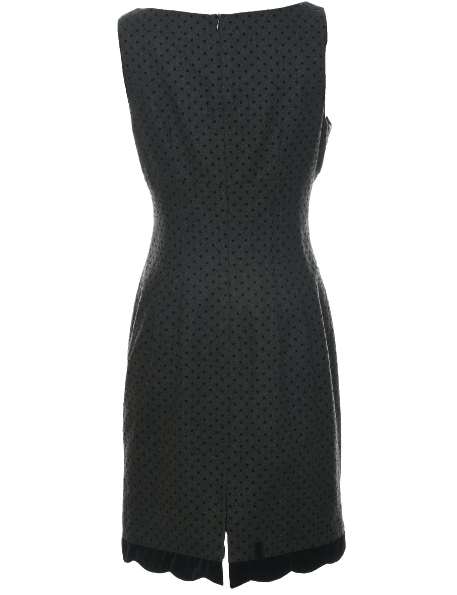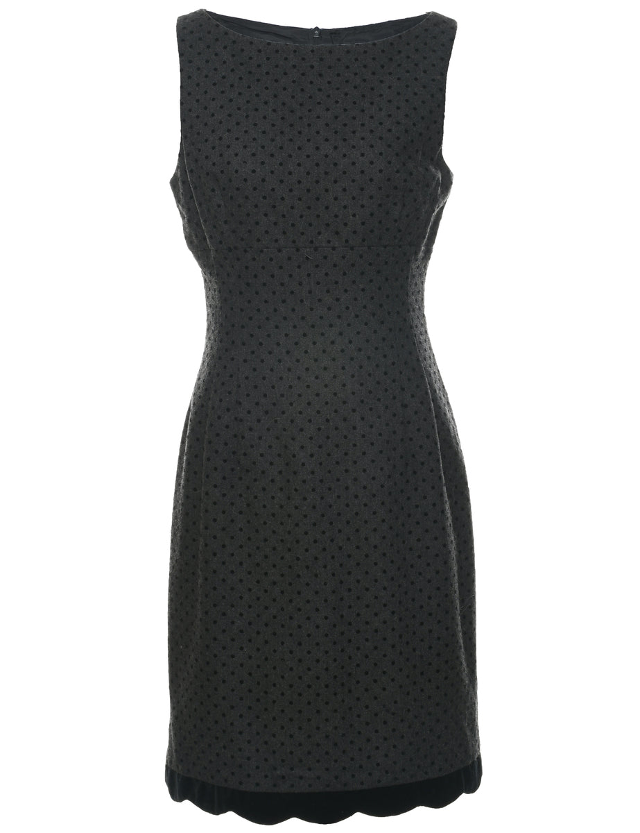 Polka dot dress in dark grey with velvet fabric, a boat neck and slit.