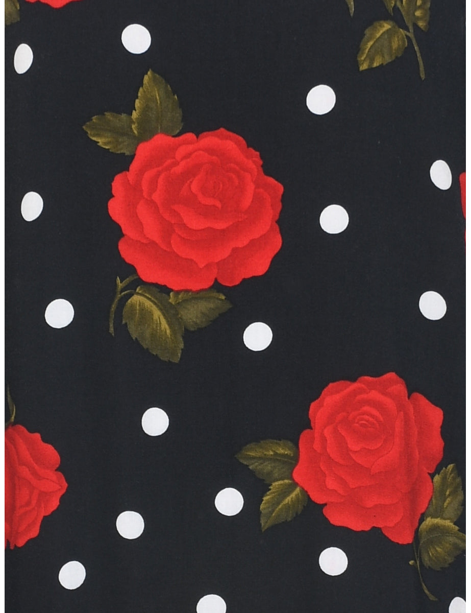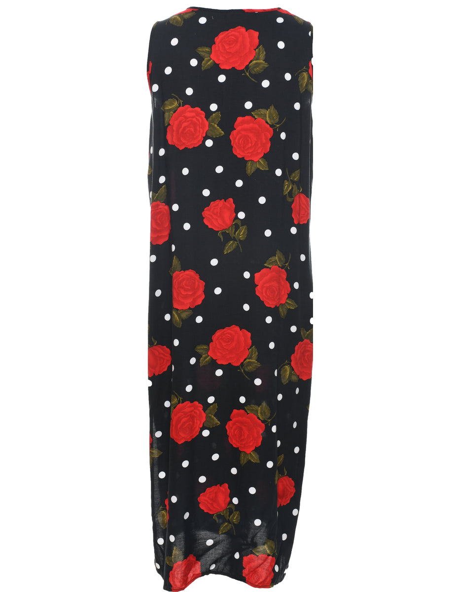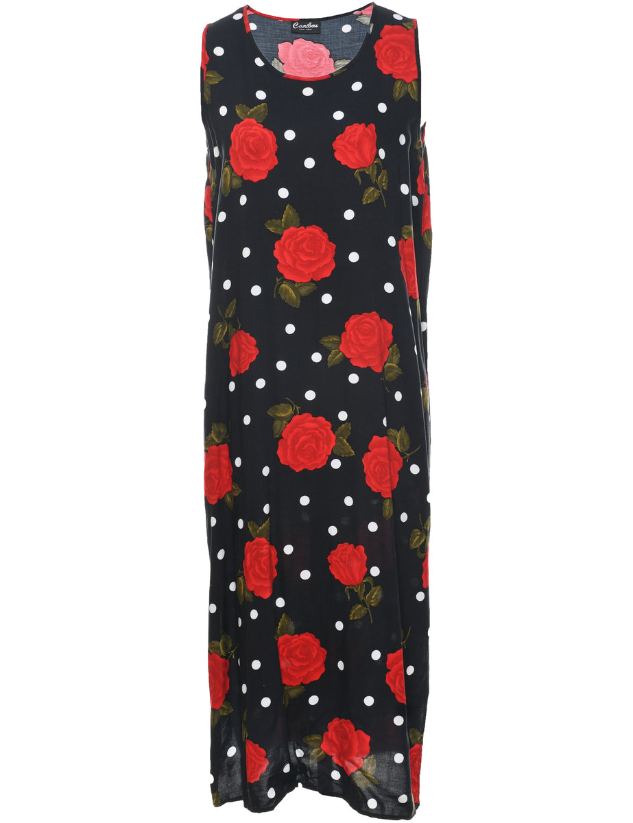 Polka dot dress with floral pattern. Comes in black with a round neck and slit.