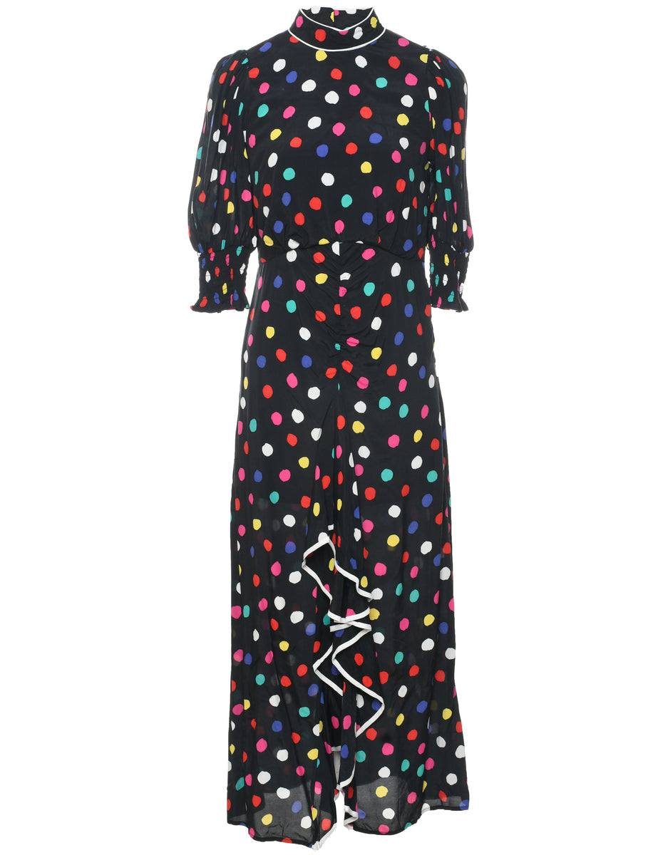Polka dot black maxi dress with a high neck and ruffles.