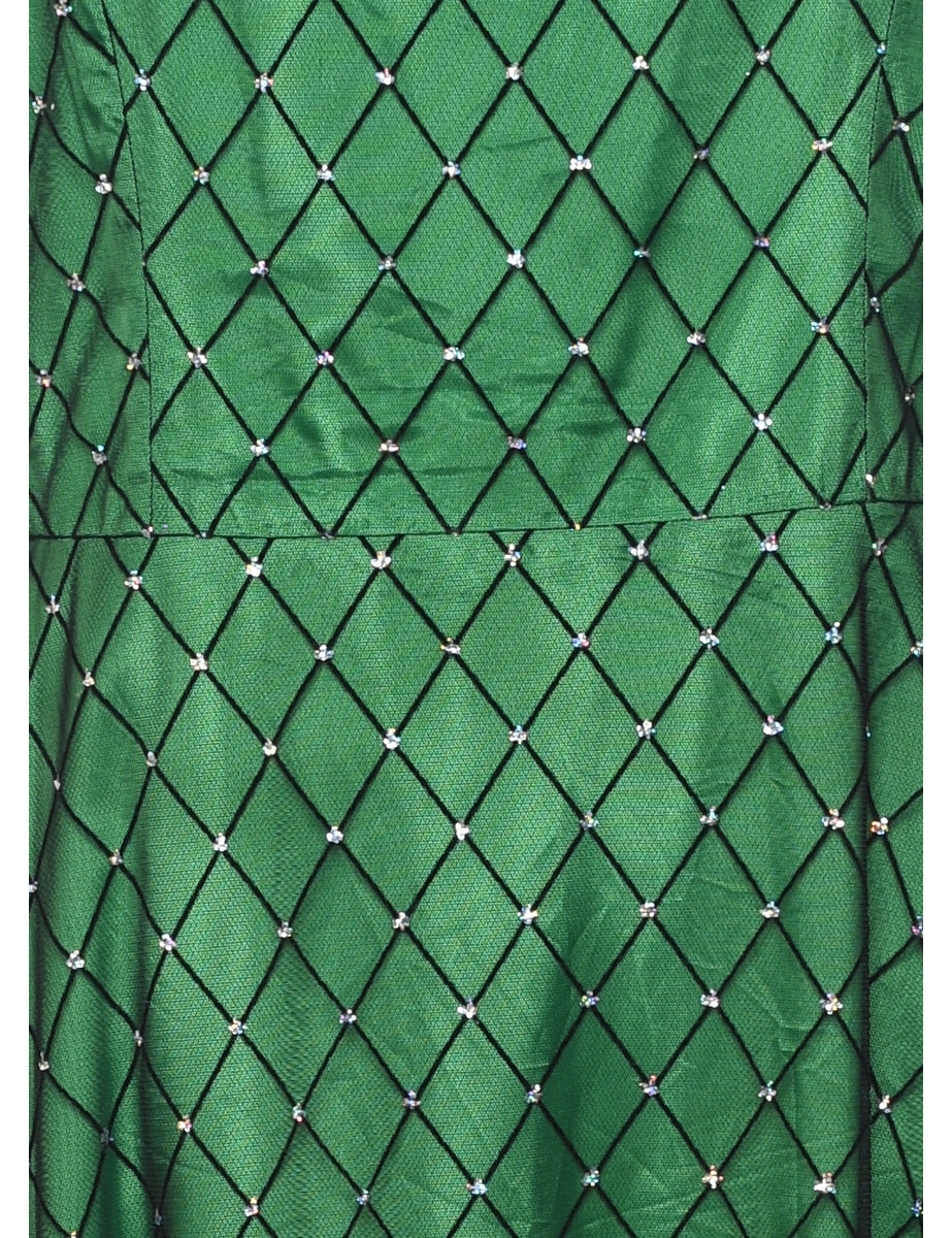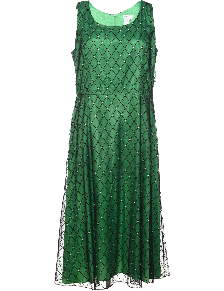 Sheer evening dress in green with a round neck and full lining.