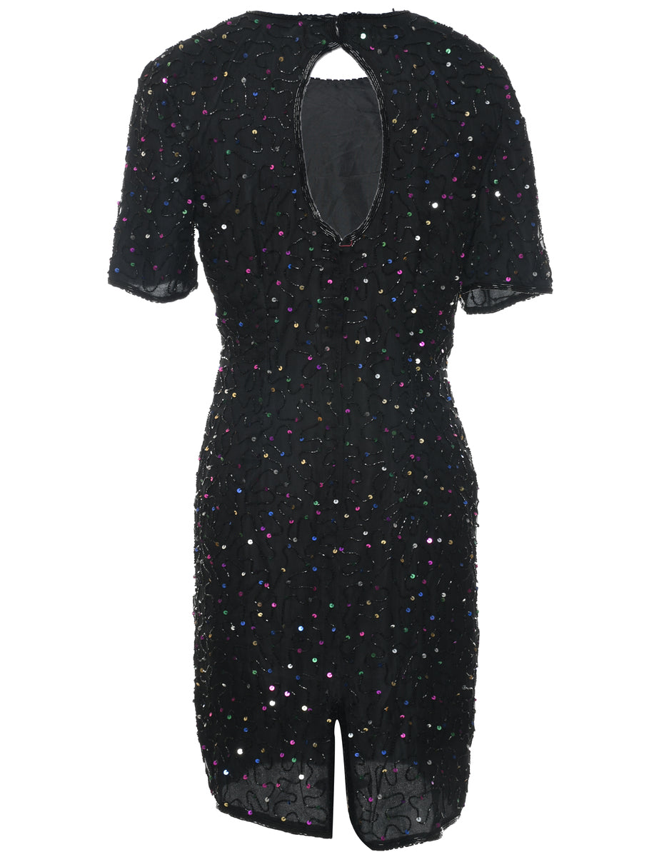 Beaded party dress in black with key hole neckline. Beading coming out from shoulder but otherwise in good condition.
