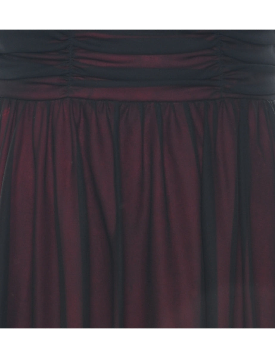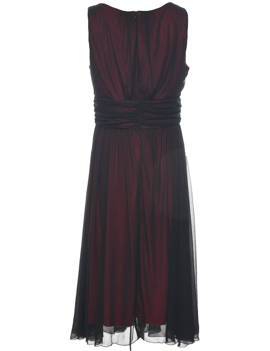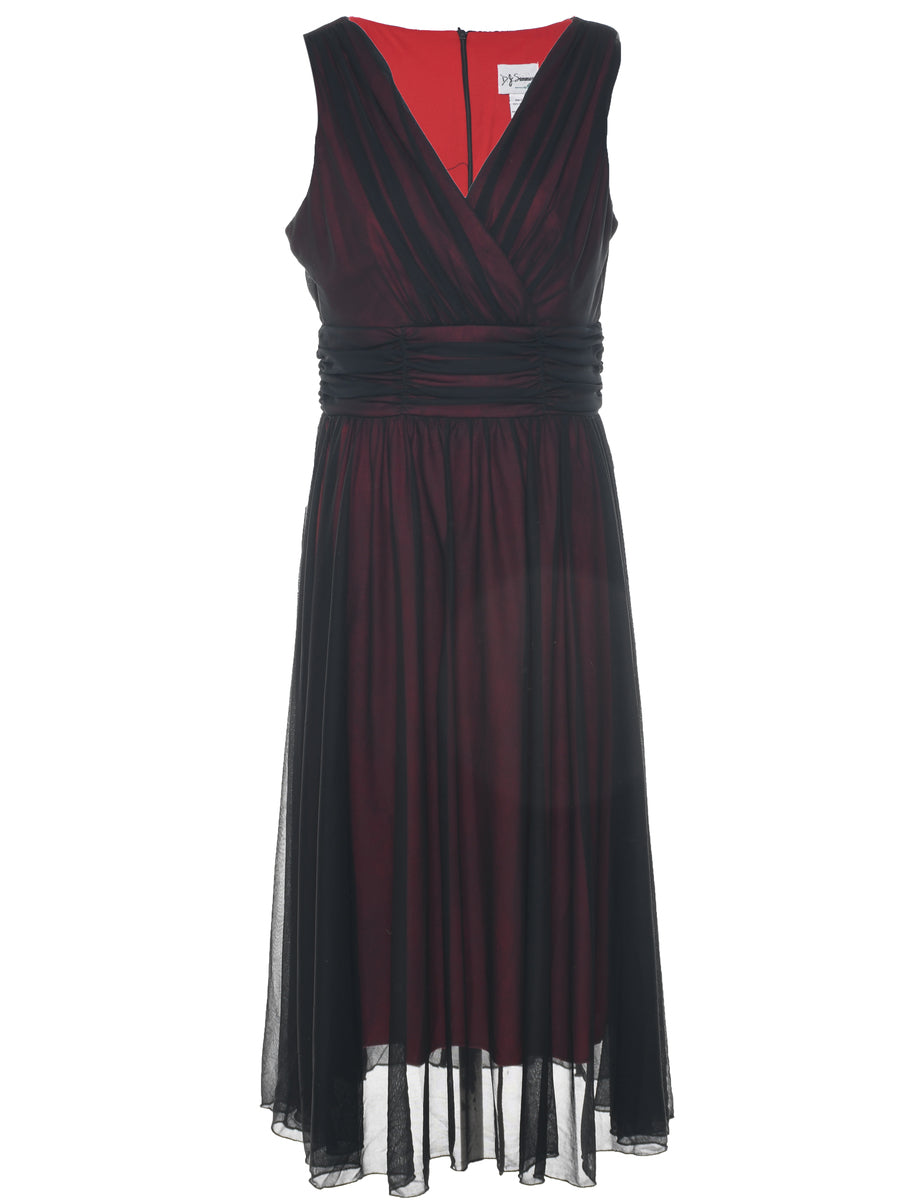 Sleeveless dress in red with a cross-over front and ruched detailing.