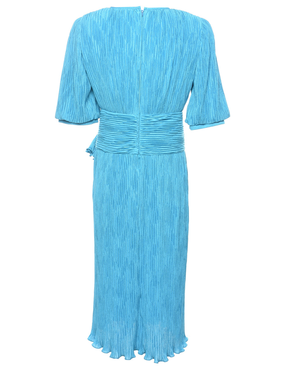 Smocked evening dress in turquoise with a pussy bow and full lining.