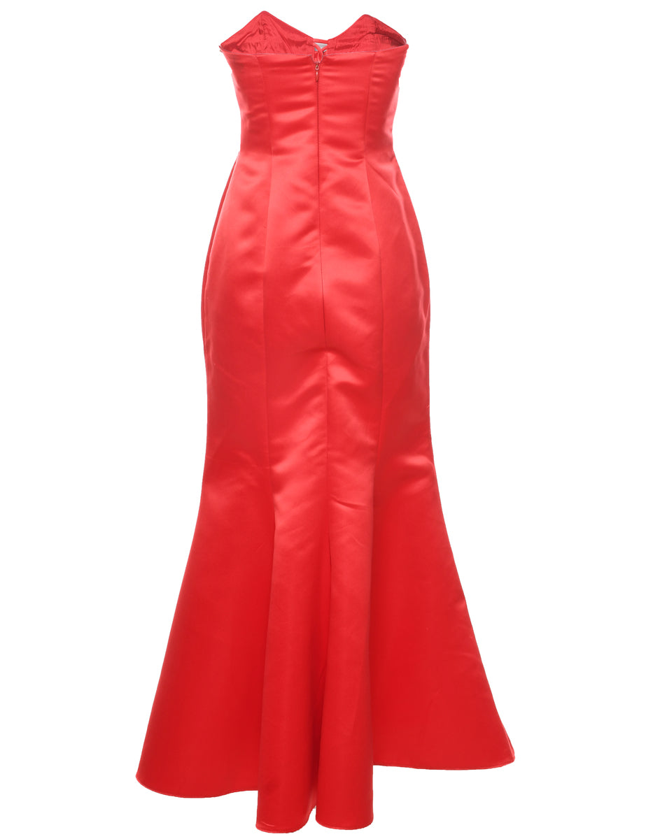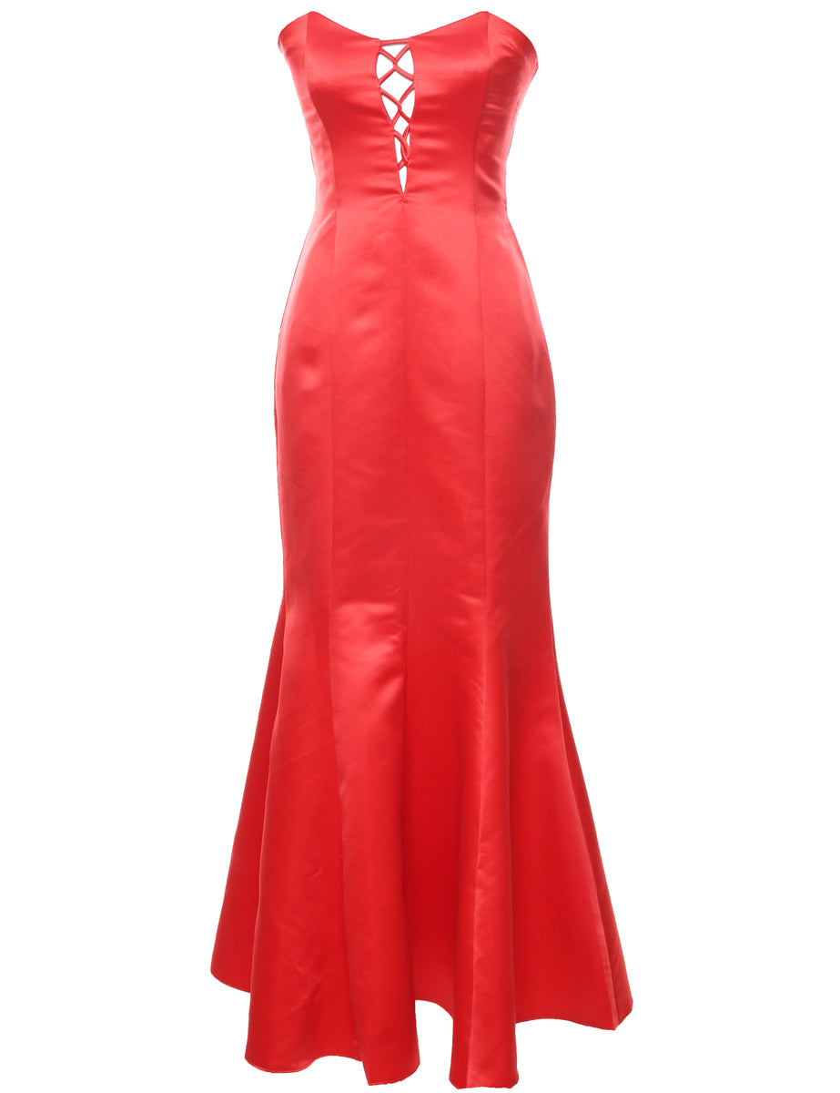 Strapless red prom dress with a sweetheart neckline and cut out detailing.