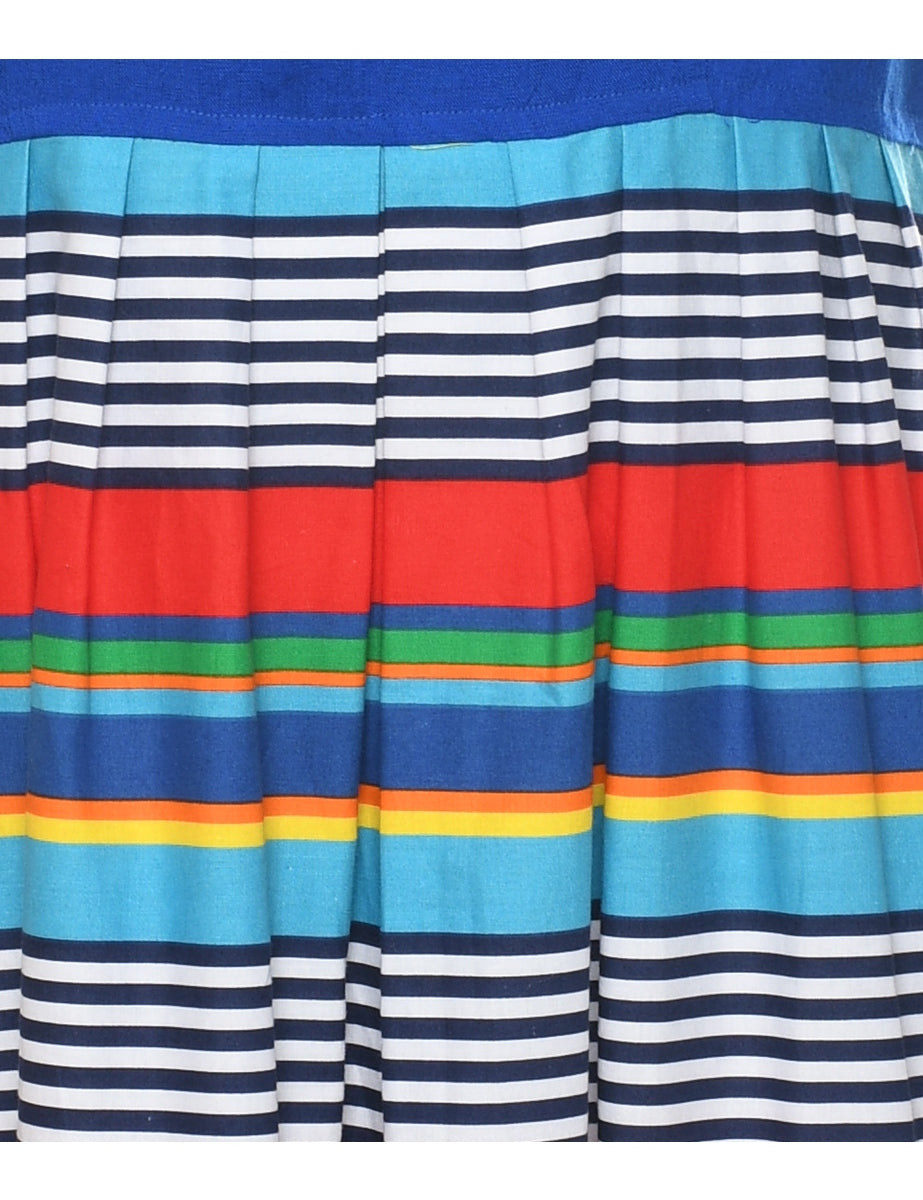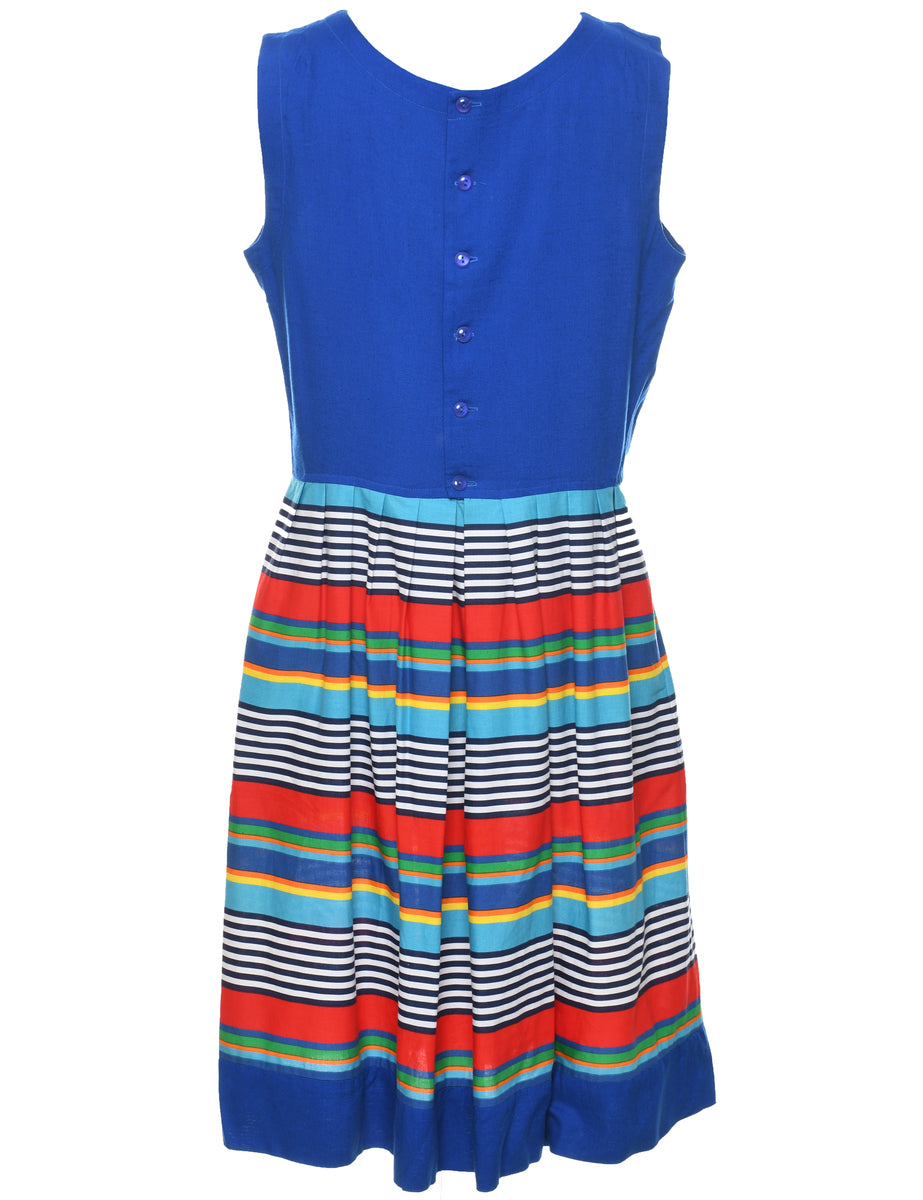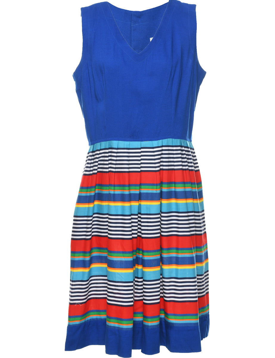 Sleeveless dress in blue with striped pattern, v neck and pleating.