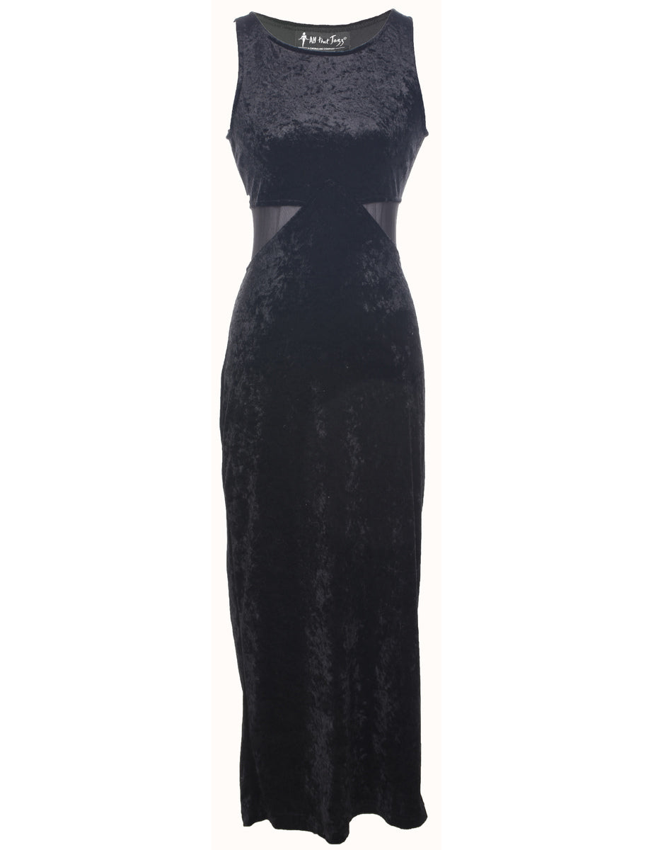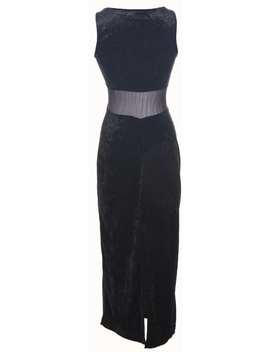 Sleeveless evening dress. Comes in black with a round neck and sheer panels.