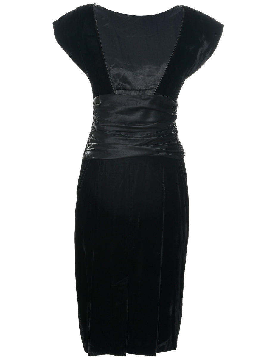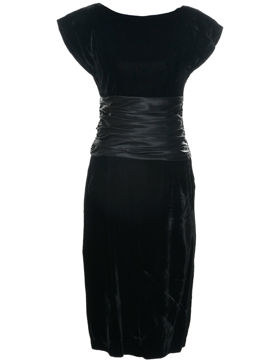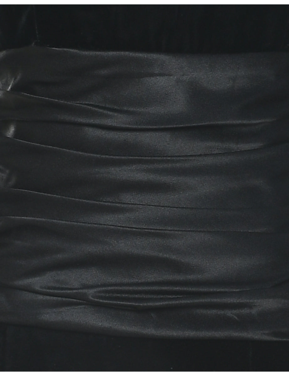 Velvet evening dress in black with ruched detailing and a pencil skirt.