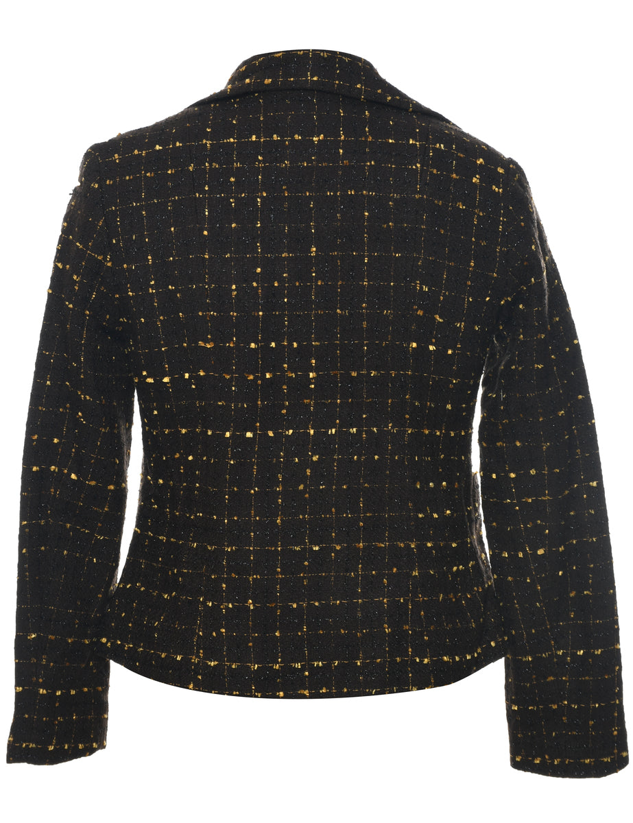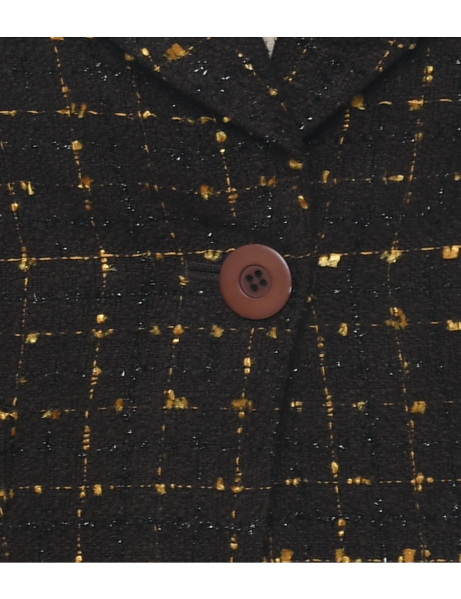 Checked blazer comes in dark brown with multiple pockets and shoulder pads.