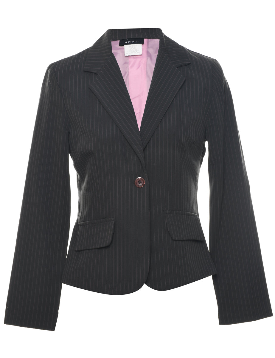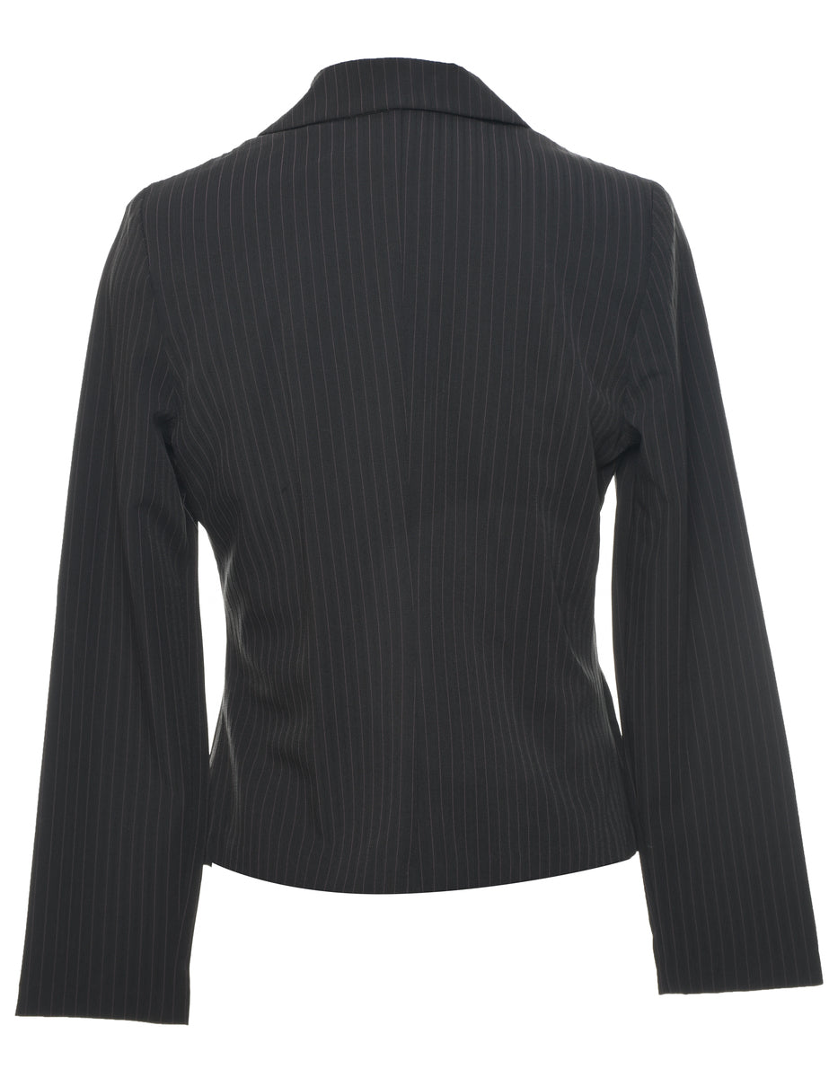 Pinstriped blazer in dark grey with shoulder pads.