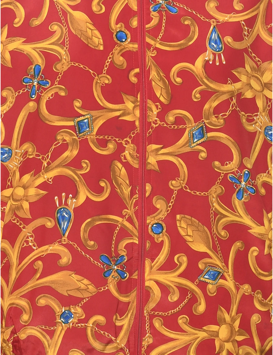 Floral pattern bomber jacket comes in red with multiple pockets.