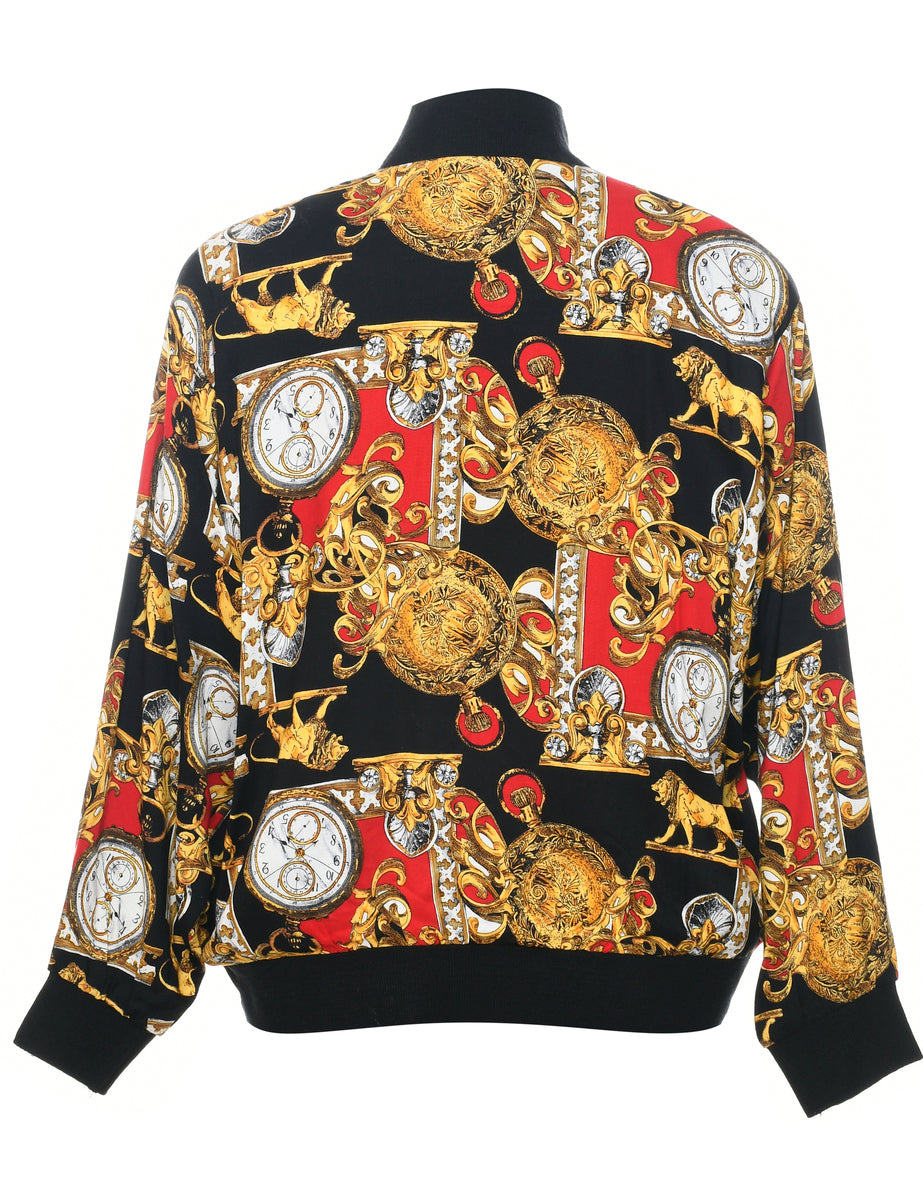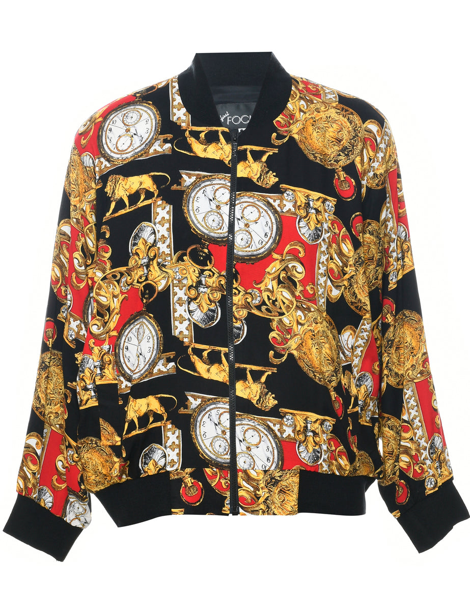 Zip front bomber jacket in multi-colour with multiple pockets and shoulder pads.