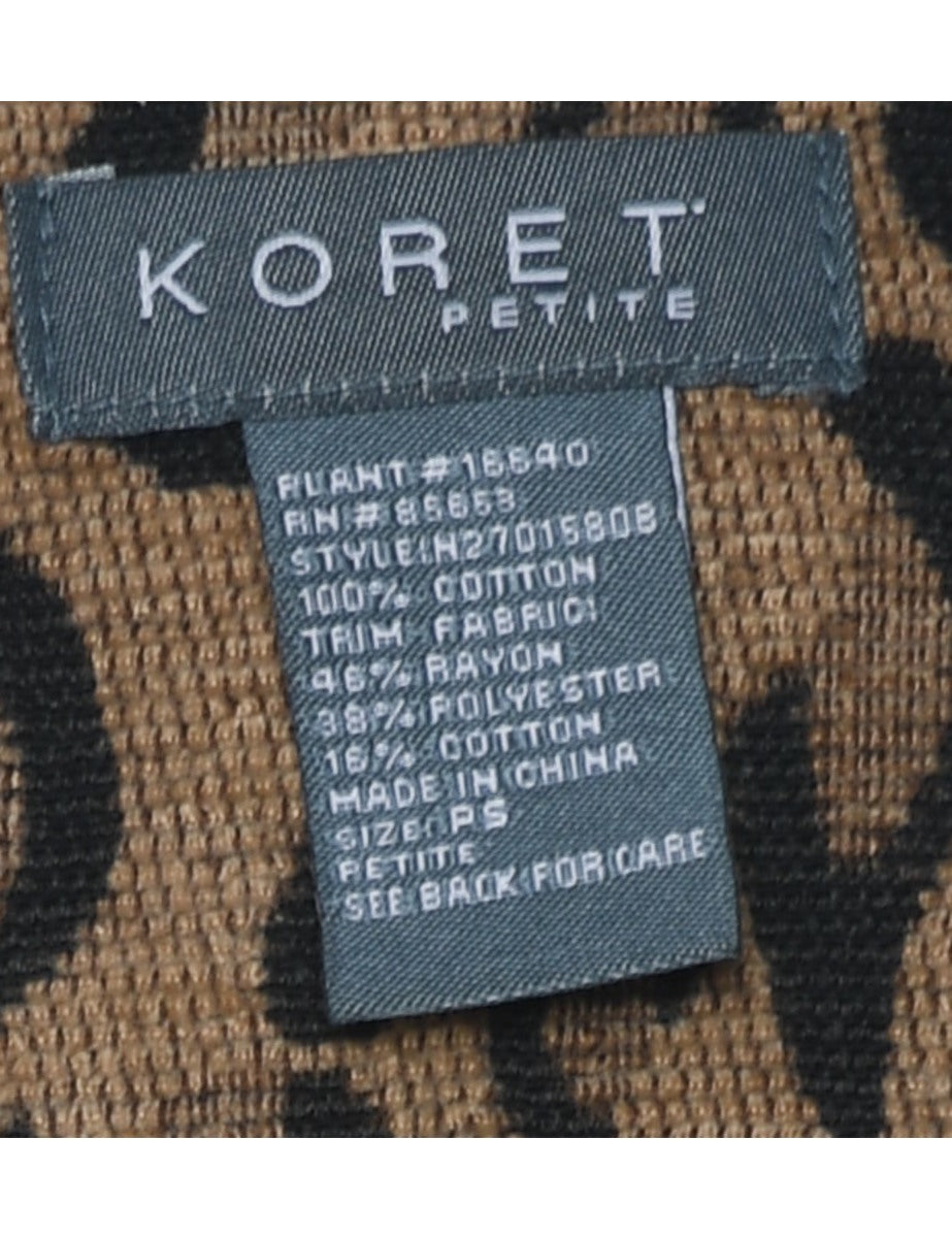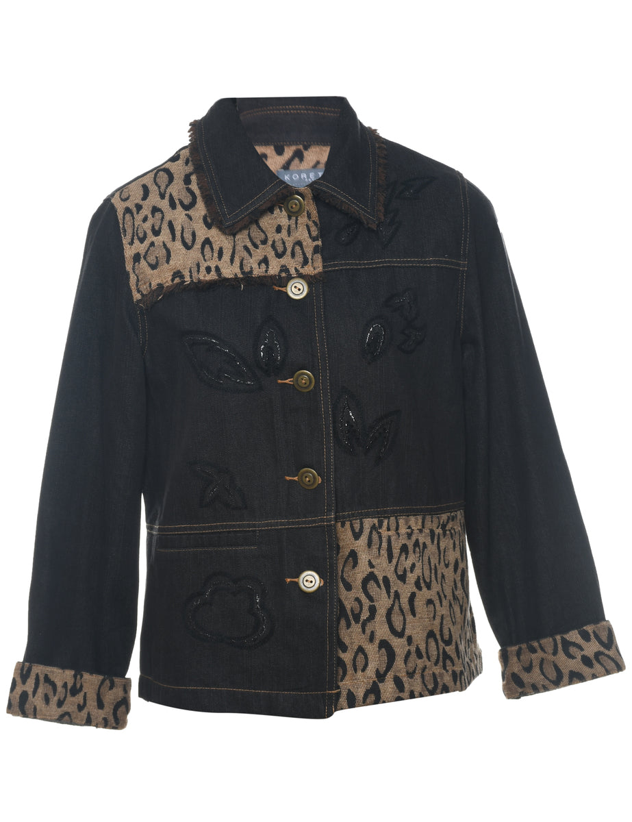 Black & brown 1990s animal print denim jacket complete with multiple pockets. The size label mentions S but based on the actual measurements we consider it a size L.