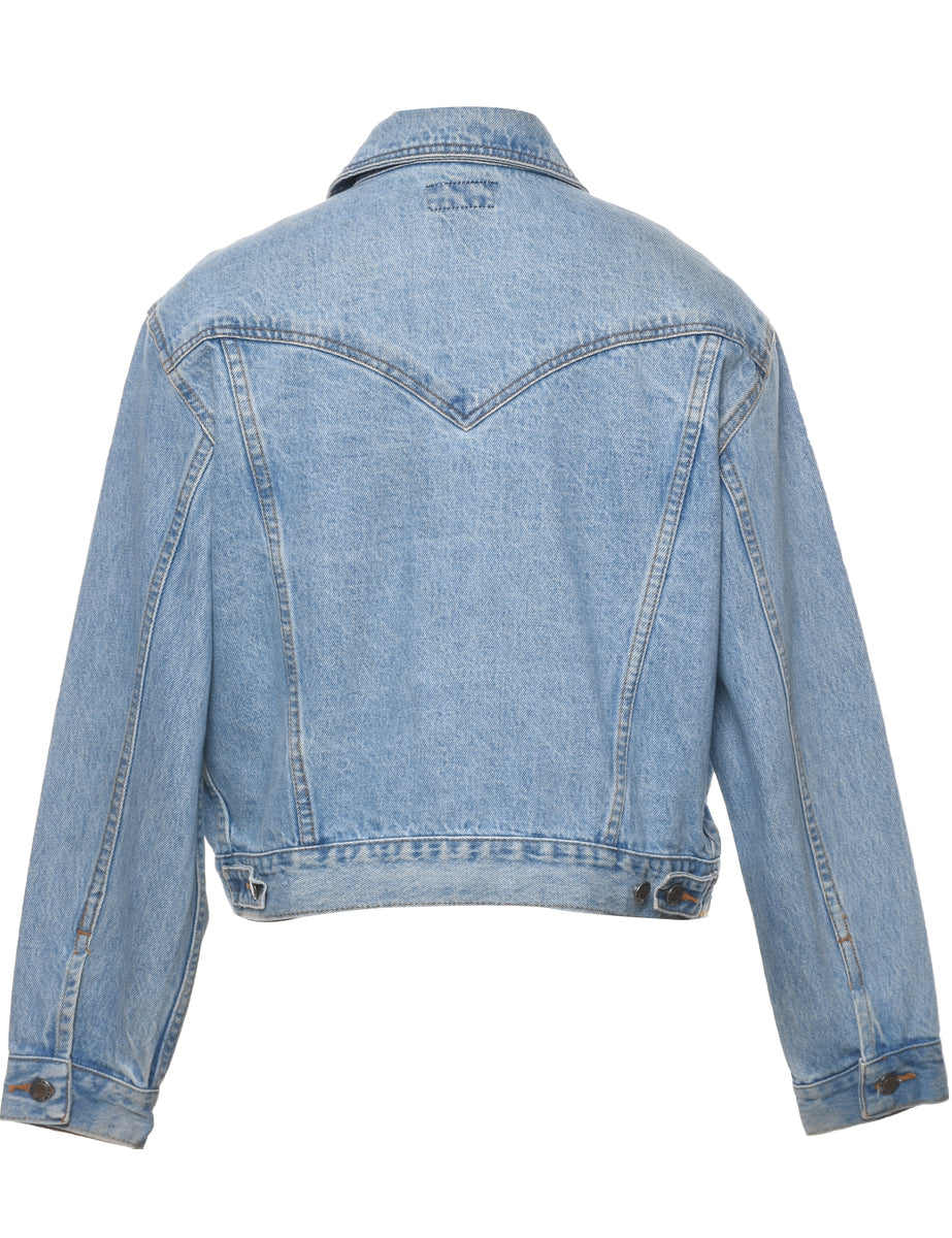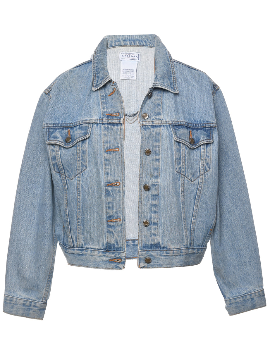 Button front denim jacket in light wash with multiple pockets. From the brand Arizona.