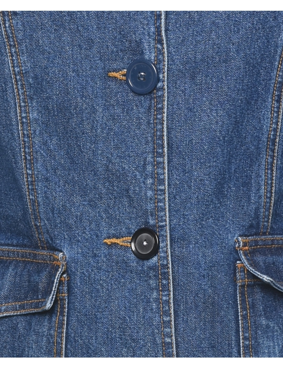 Single breasted denim jacket. Bill Blass in dark wash with multiple pockets. The size label mentions S but based on the actual measurements we consider it a size M.