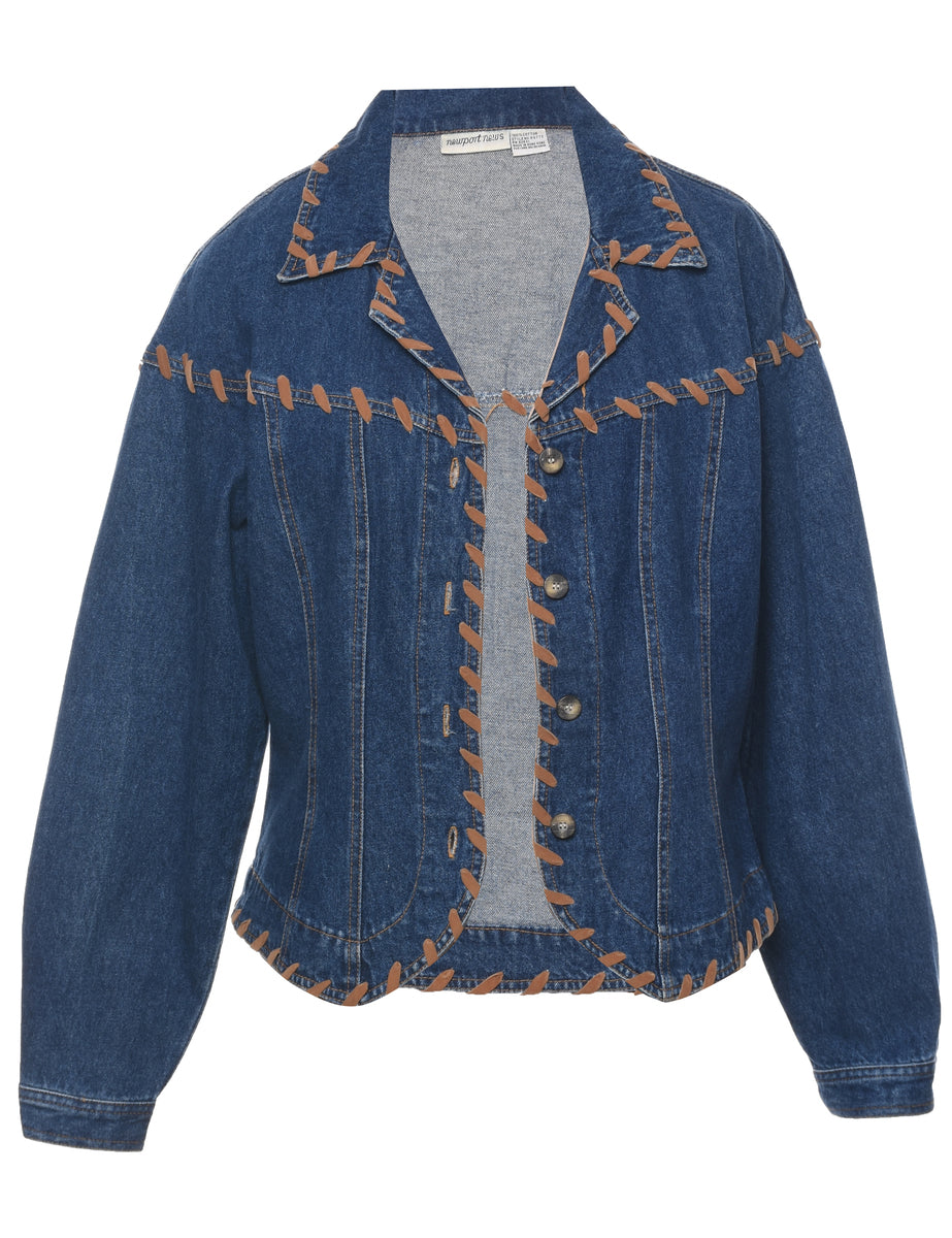 Button front medium wash denim jacket with contrast stitching.