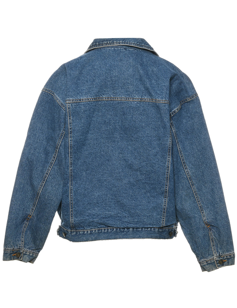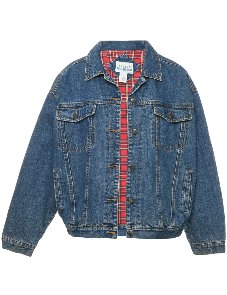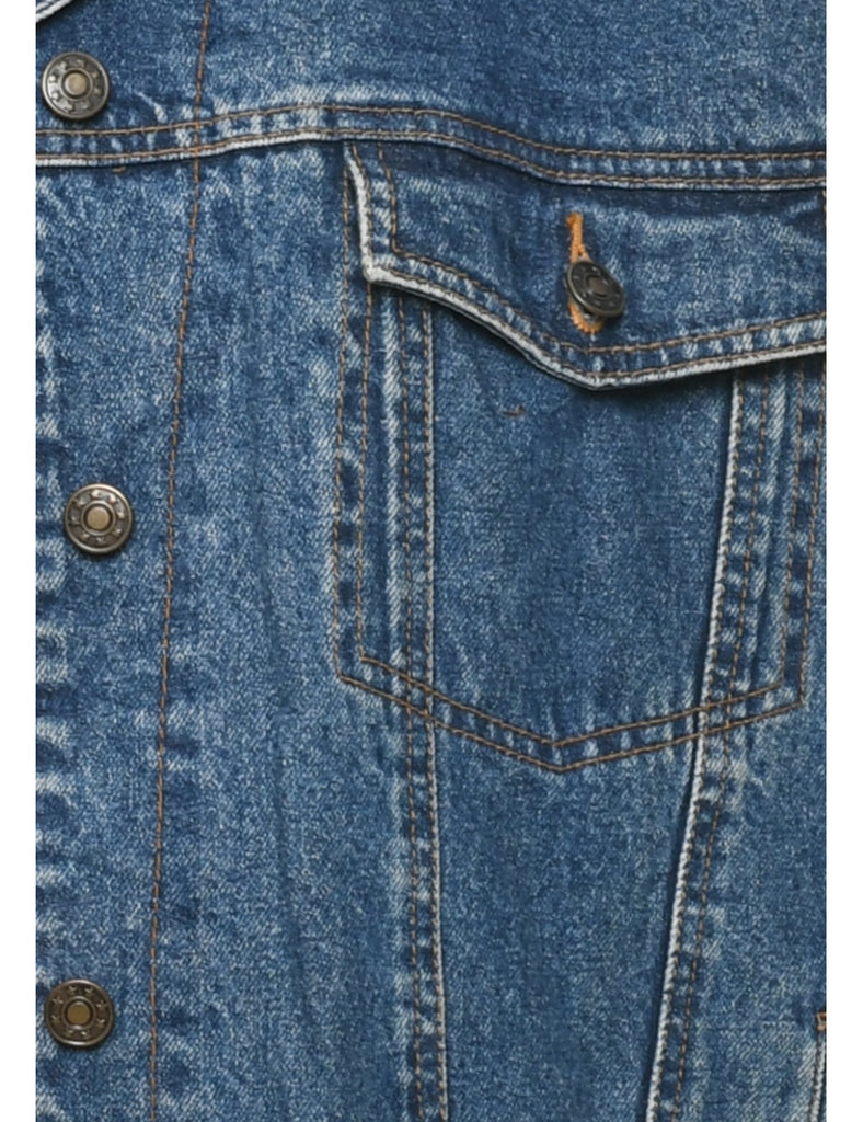 Button front denim jacket. Comes in medium wash with multiple pockets.