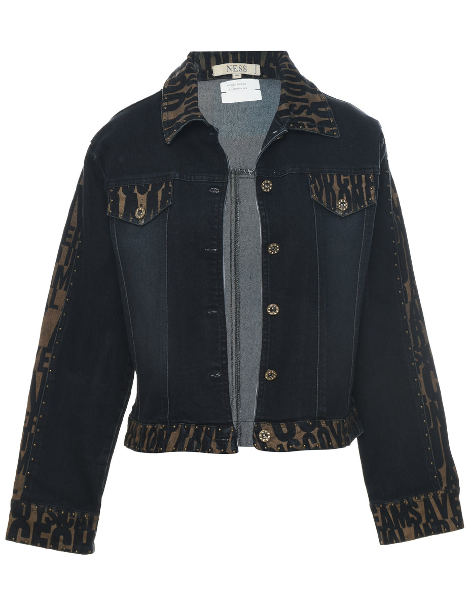 Button front denim jacket in black with multiple pockets.