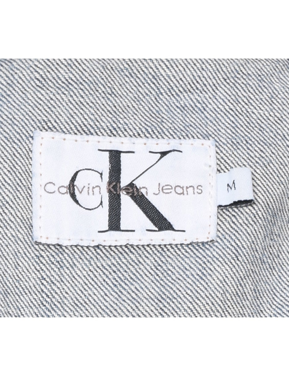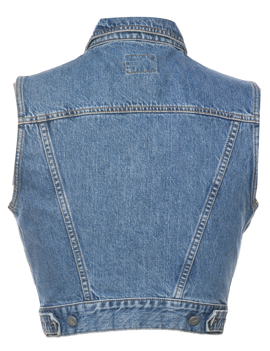Button front denim jacket vest. Comes in medium wash with multiple pockets.