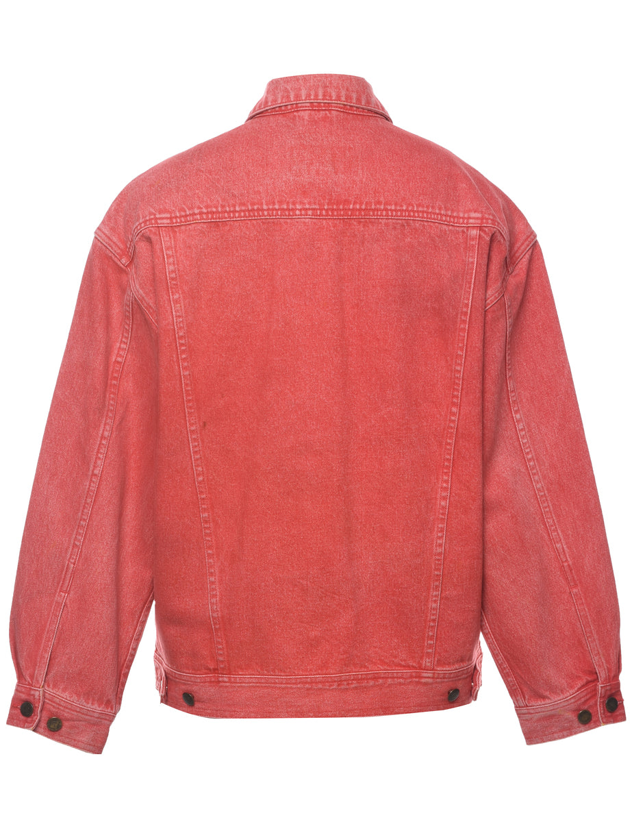 Button front denim jacket in salmon pink with multiple pockets. From the brand Eddie Bauer.