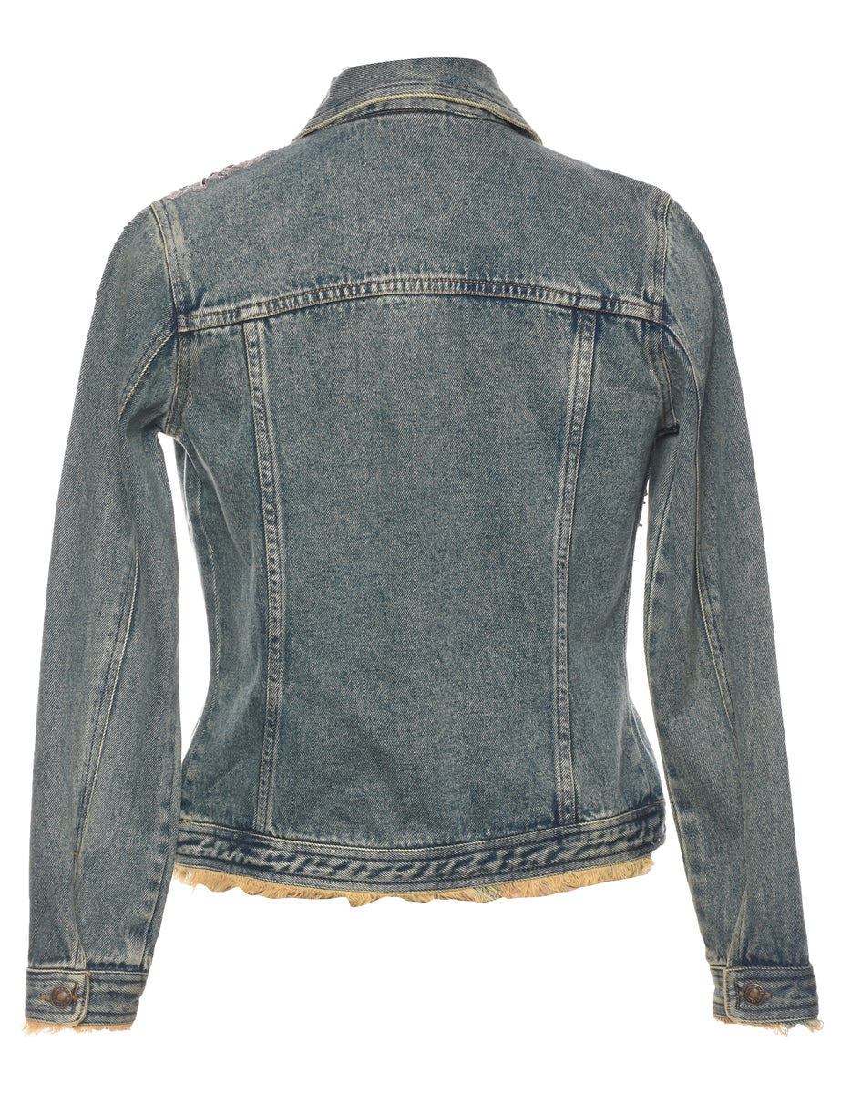 Embellished denim jacket. Comes in stone wash with beading and multiple pockets.