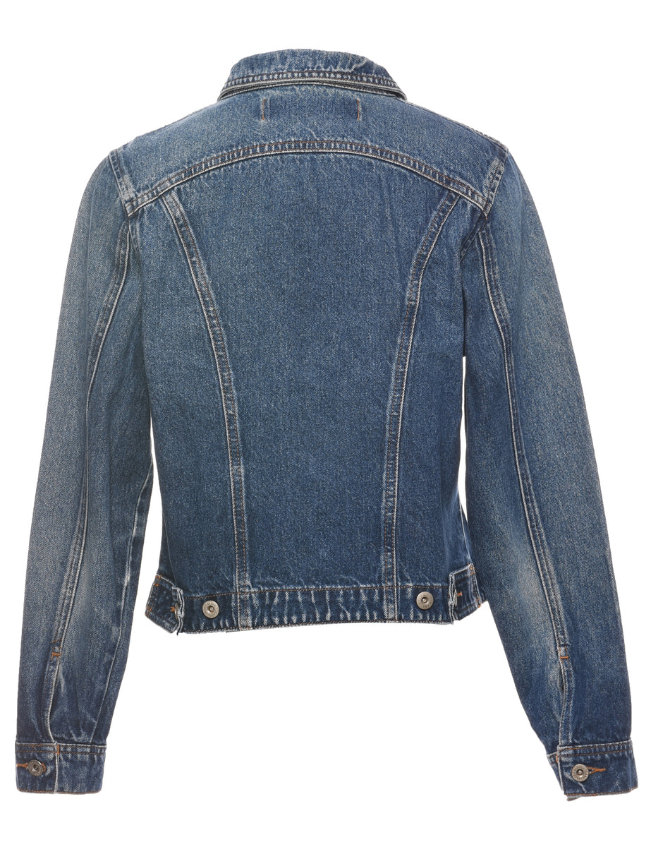 Button front denim jacket. Faded Glory in medium wash with multiple pockets.