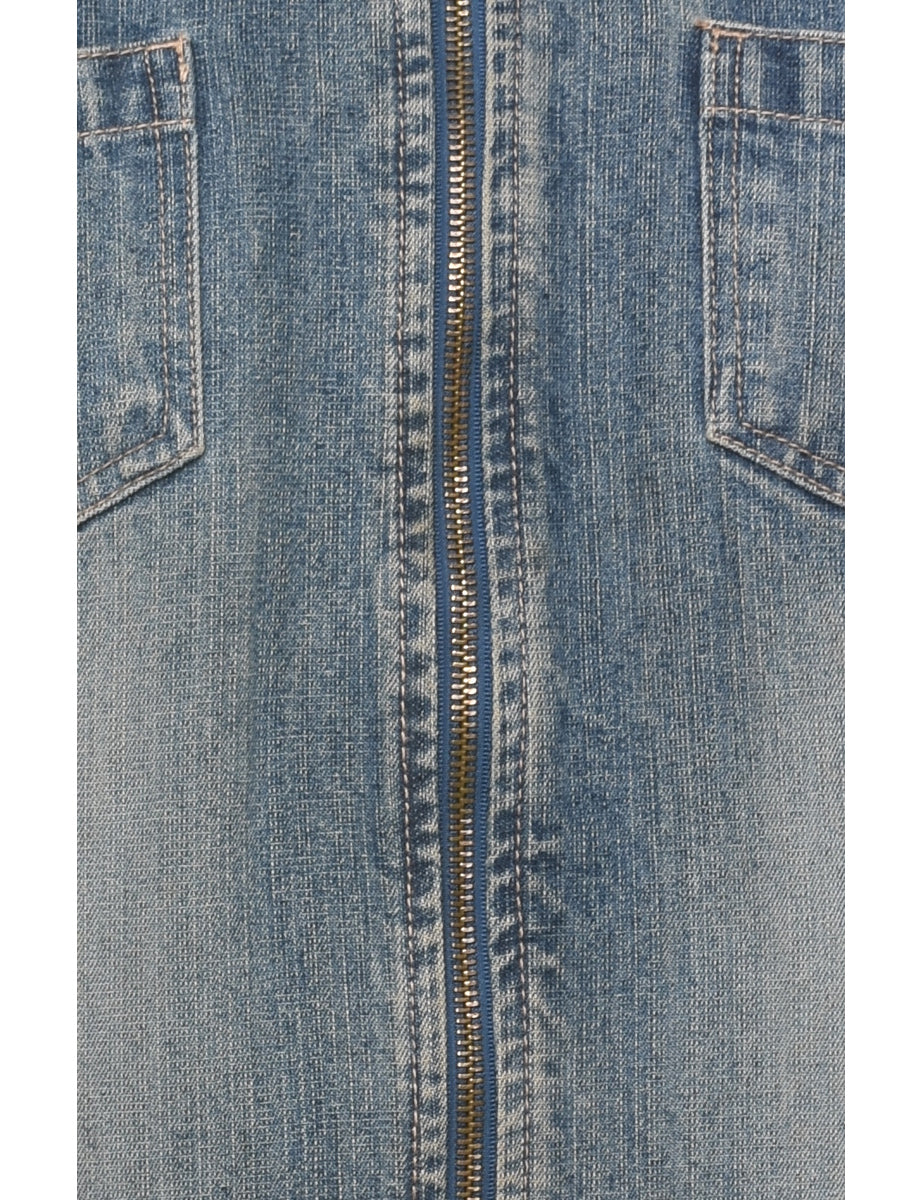 Zip front denim jacket in medium wash with multiple pockets and frayed hem.