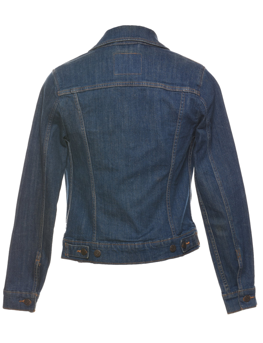 Button front denim jacket. Comes in dark wash with multiple pockets.