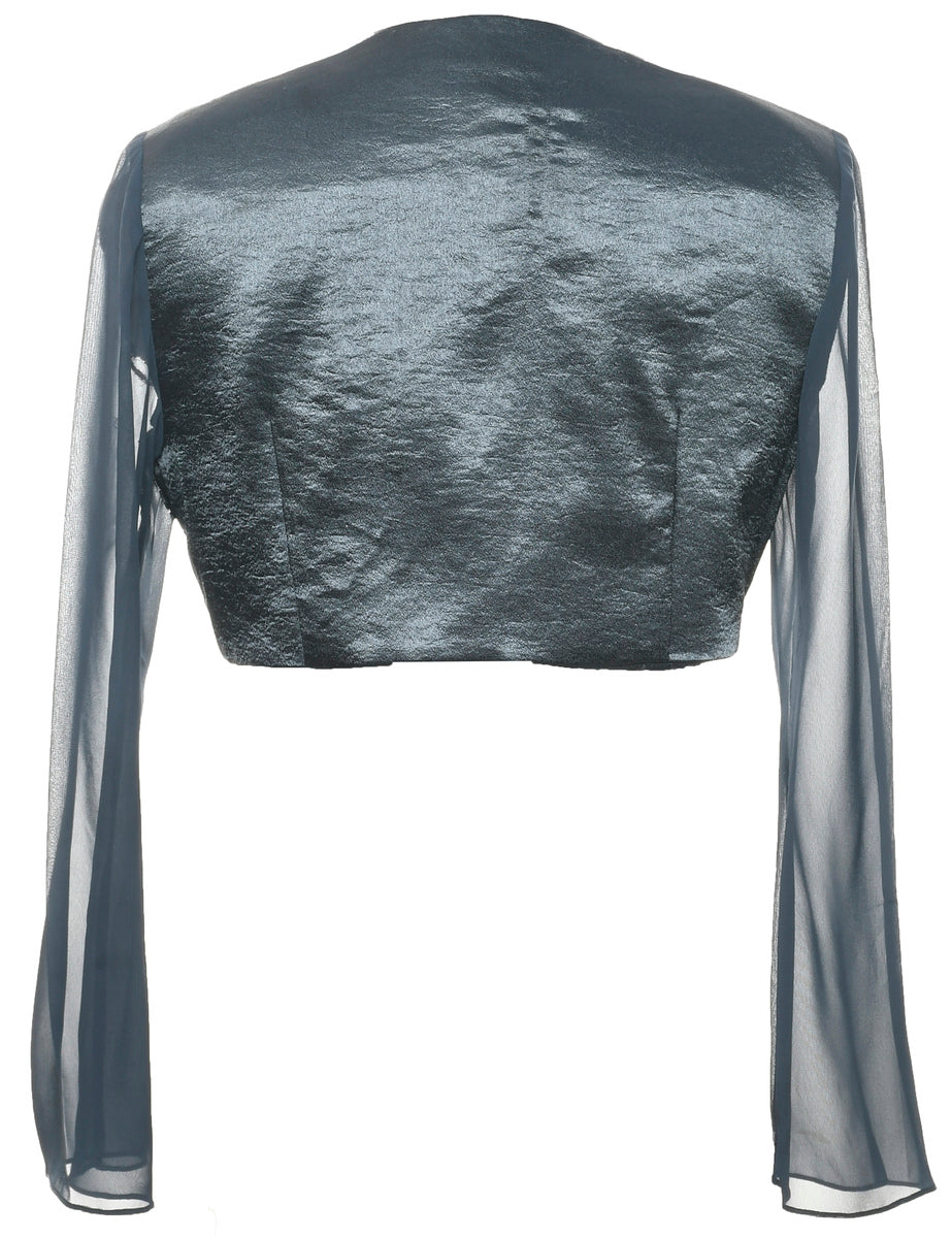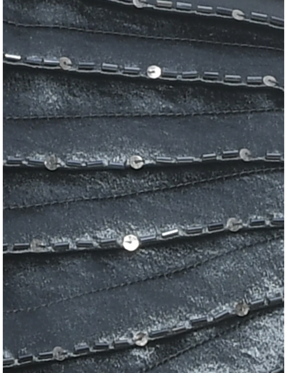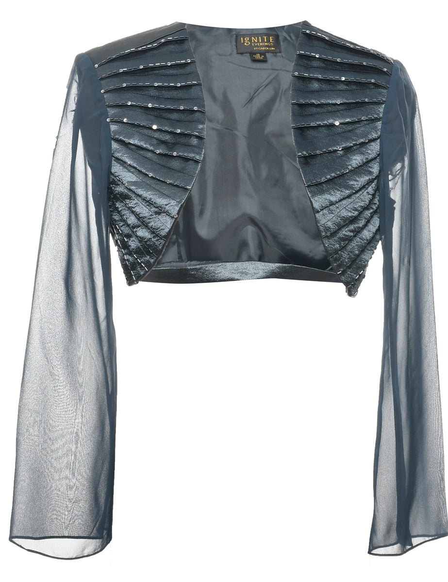 Beaded bolero jacket in dark grey with pleating and shoulder pads.