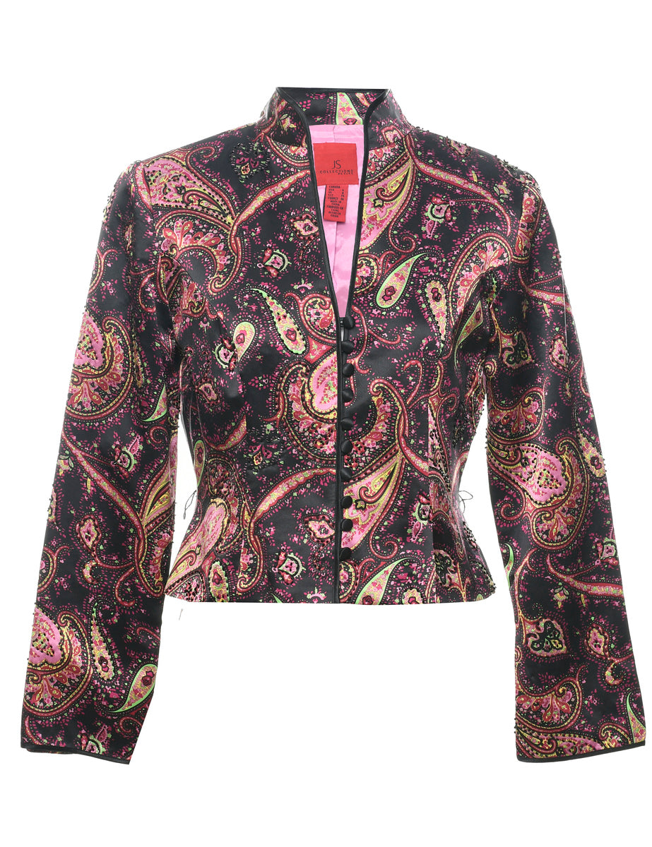 Beaded evening jacket with paisley pattern comes in multi-colour with shoulder pads.