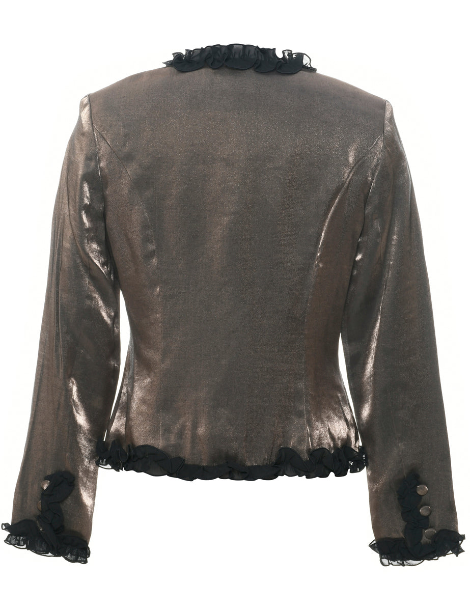 Button front copper evening jacket with shoulder pads and decorative trim.