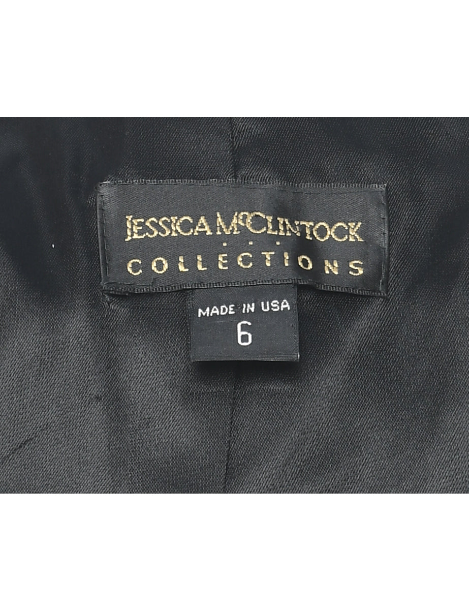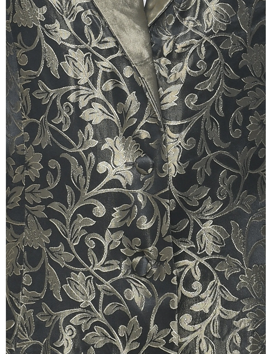 Floral pattern evening jacket in black with shoulder pads and contrasting fabric trim.