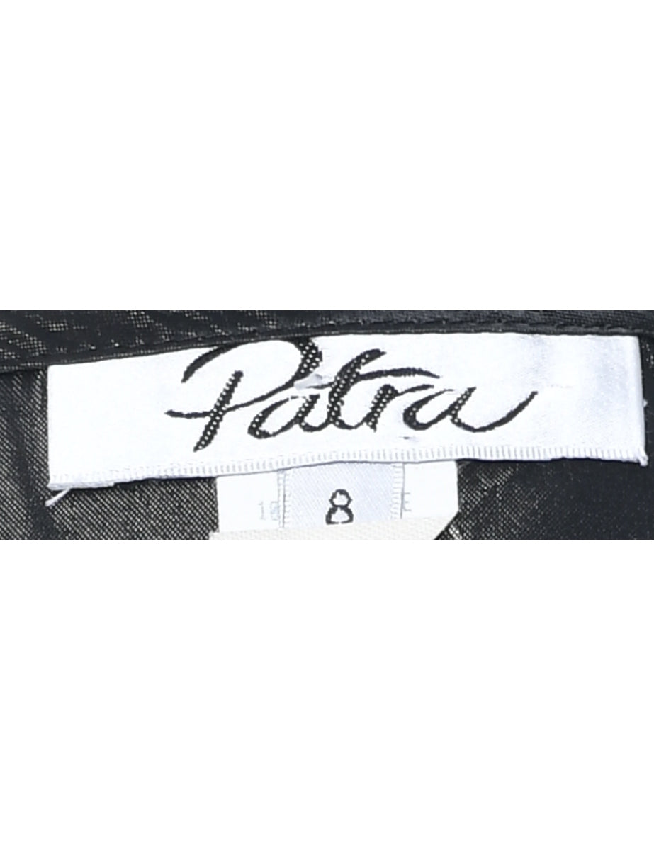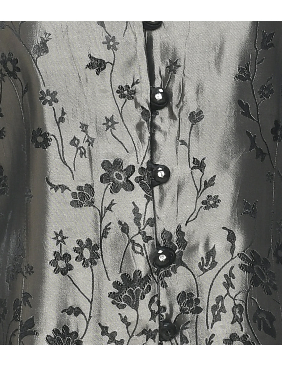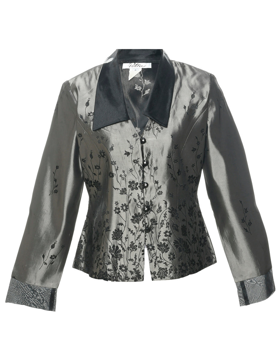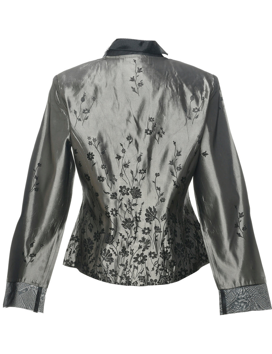 Floral pattern evening jacket comes in grey with shoulder pads and contrasting fabric trim.